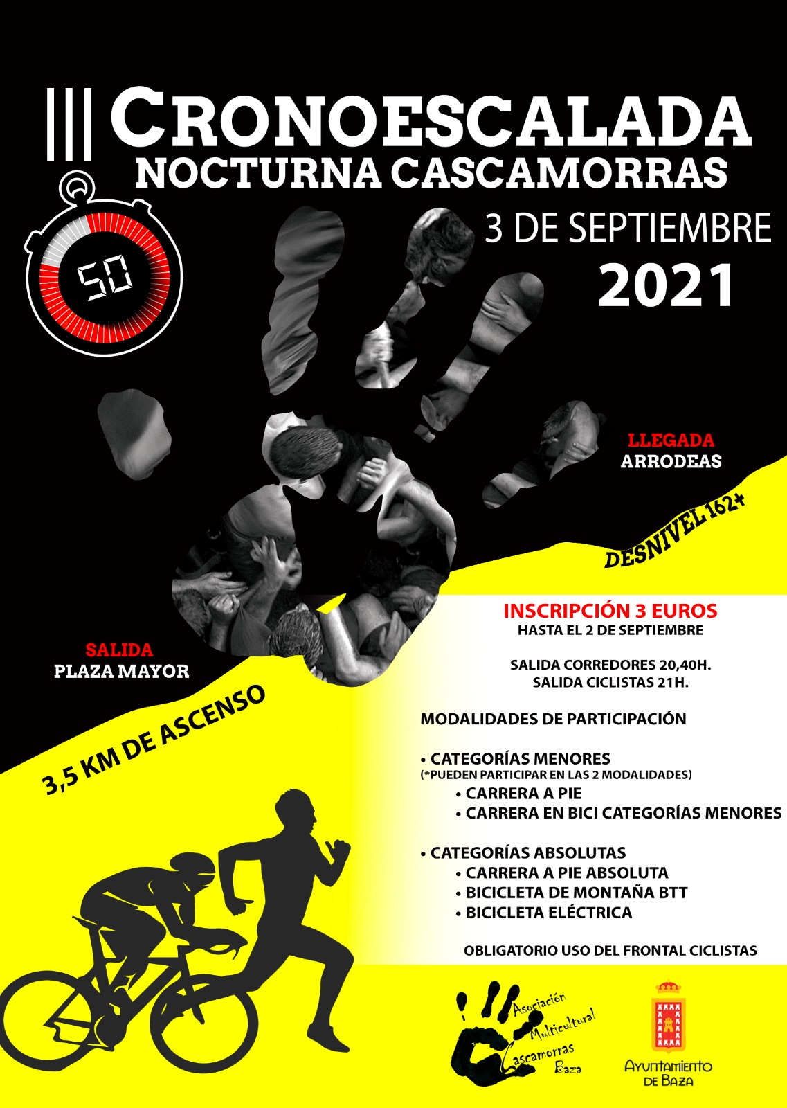 Abierto el plazo de inscripción de la III Cronoescalada Nocturna Cascamorras Baza que se celebrará el próximo viernes. El Ayuntamiento de Baza informa que ya están abiertas las inscripciones para la III Cronoescalada Nocturna Cascamorras Baza del próximo 3 de septiembre, prueba que cuenta con la colaboración de la Asociación Multicultural Cascamorras Baza. Las modalidades de participación son: carrera a pie, bicicleta BTT y bicicleta eléctrica. También habrá categorías de menores, con un recorrido adaptado.