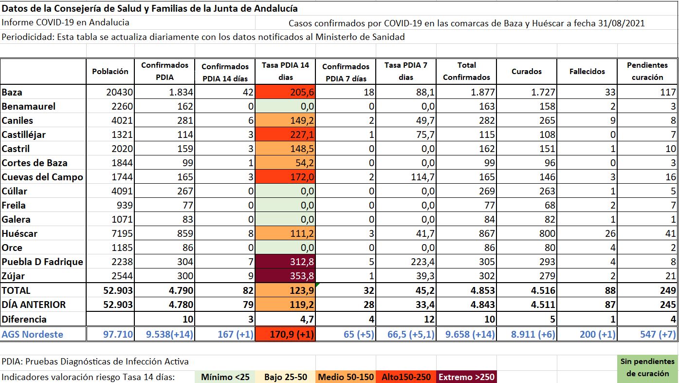 La última jornada arrojó otros 10 positivos en las comarcas de Baza y Huéscar y 14 en el AGS Nordeste. 10 positivos de los que la mitad se detectaron en Baza, además de 2 en Caniles y uno en Castilléjar, Puebla de don Fadrique y Zújar, produciendo leves subidas en sus respectivas tasas de incidencia, mientras que Castril y Huéscar mejoraban su situación, con cambio de nivel sanitario para la localidad castrileña, que pasaba a nivel medio, cuando el día anterior estaba en nivel alto.