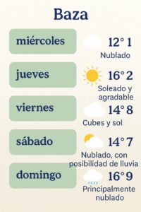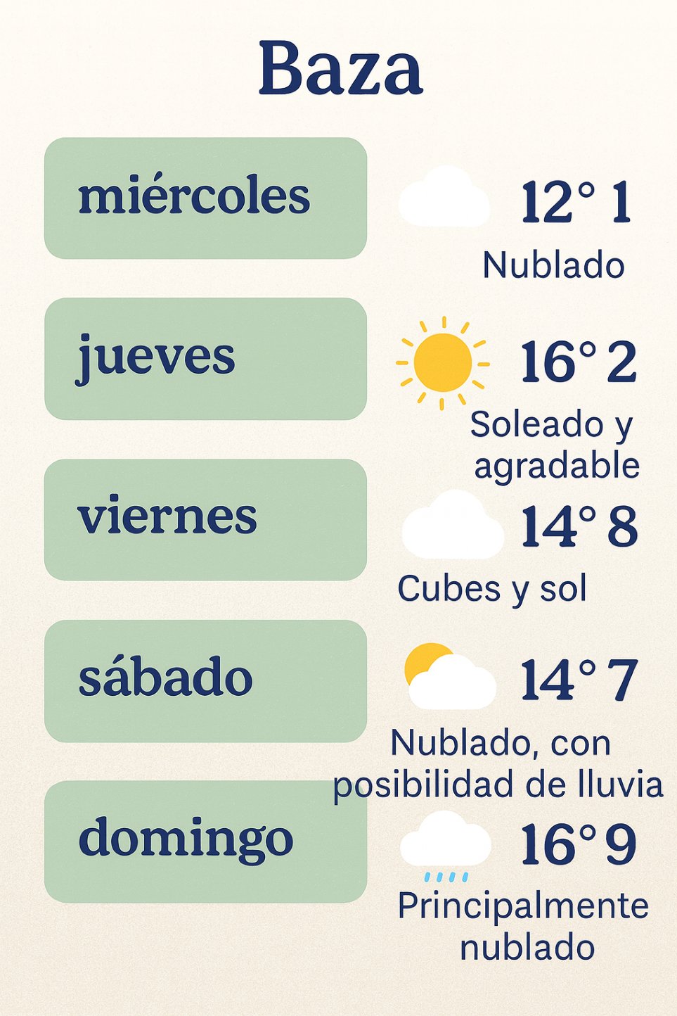 En los próximos días, Baza vivirá cambios variables en su climatología. Un clima que para hoy miércoles se presenta nublado, con temperaturas suaves por la mañana y la noche algo frescas, oscilando entre unos 12 °C de máxima y rondando 1 °C al amanecer. Mañana jueves será probablemente la jornada más agradable, con cielos despejados, sol y máximas cercanas a los 16 °C, aunque las mínimas volverán a bajar hasta los 2 °C, así que convendrá llevar ropa de abrigo durante la noche.