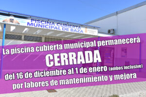 La Piscina Municipal Cubierta permanecerá cerrada durante la segunda quincena de este mes para realizar tareas de mantenimiento y mejora. La concejalía de Deportes del Ayuntamiento de Baza ha informado por redes sociales de que la Piscina Cubierta Municipal permanecerá cerrada entre el 16 de diciembre y el 1 de enero, ambos inclusive, debido a una serie de labores de mantenimiento y mejora que van a afrontarse en esta instalación, a la espera de que sus usuarios disculpen las molestias que les pueda ocasionar.