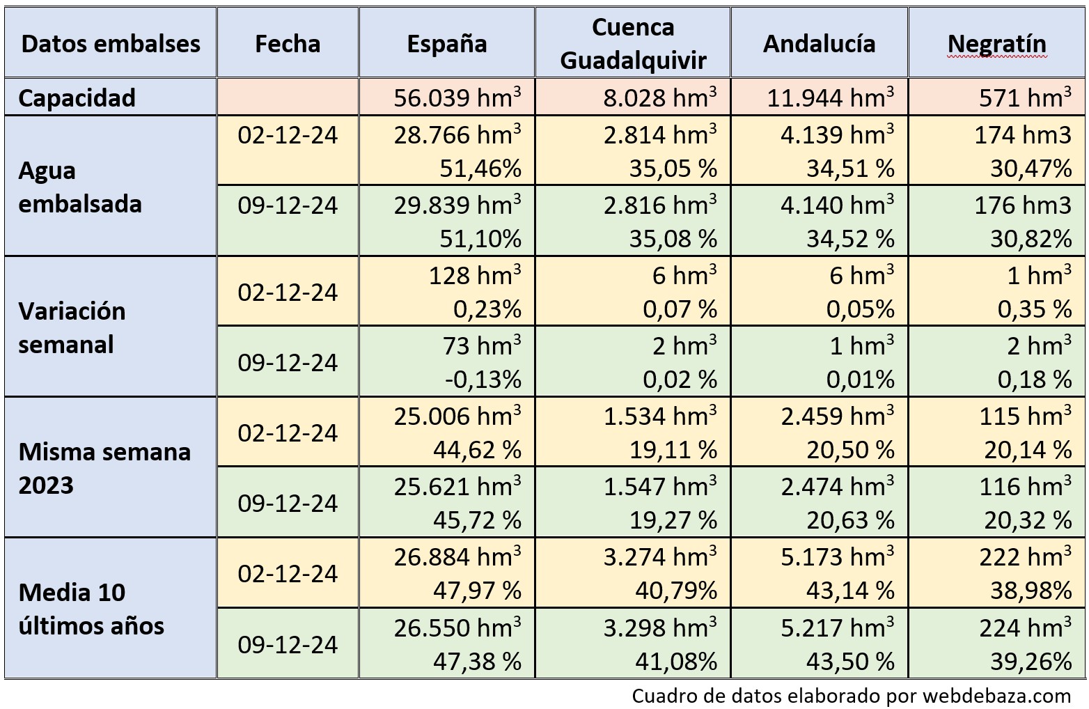 La reserva hídrica española se encuentra al 51,5% de su capacidad, tras volver a ganar agua embalsada en la última semana, mientras el embalse del Negratín crece hasta los 176 hm3. La reserva hídrica española está al 51,5% de su capacidad total. Los embalses almacenan actualmente 28.839 hectómetros cúbicos (hm³) de agua, aumentando en la última semana en 73 hectómetros cúbicos, equivalentes al 0,1% de la capacidad total actual de los embalses.