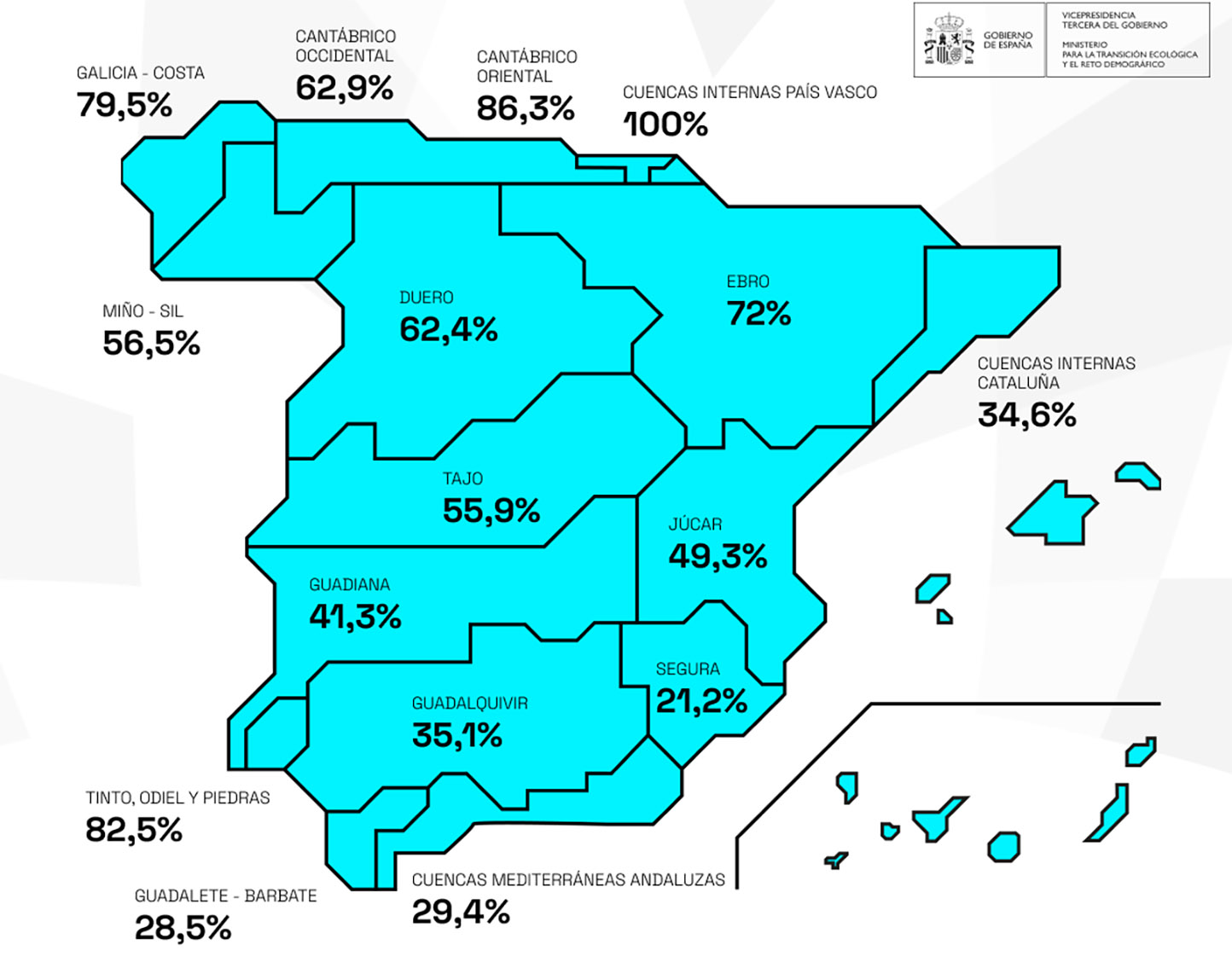 Y, finalmente, por debajo de 30% están la Cuenca Mediterránea Andaluza al 29,4%, Guadalete-Barbate al 28,5%, Segura al 21,2%.