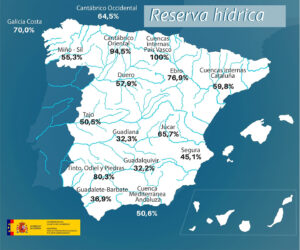 En cuanto a la distribución de esta reserva por ámbitos geográficos, superan el 80% de su capacidad la Cuenca del Cantábrico Oriental, las Cuencas internas del País Vasco, la Cuenca del Tinto, Odiel y Piedras; entre el 50 y el 80% están la Cuenca del Cantábrico Occidental, la del Miño-Sil, la de Galicia Costa, la del Duero, la del Tajo, la Cuenca Mediterránea Andaluza, la del Júcar, las Cuencas internas de Cataluña y la del Ebro. Además, la del Segura está al 45,1%, la del  Guadalete-Barbate al 36,9%, la del Guadiana al 32,3% y la del Guadalquivir al 32,2%.