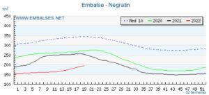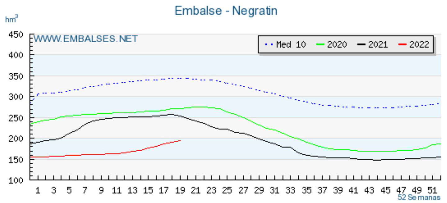 Por lo que se refiere al Embalse del Negratín, a día de ayer tenía embalsados 194 hm3 que equivalen al 34.22% de su capacidad total que es de 567 hm3 . De esta forma, ha mejorado con respecto a la semana anterior aumentando el agua embalsada en un 0,71% que equivales a 4 hm3. A nivel comparativo, en la misma Semana del año 2021, el agua embalsada era de 254 hm3 que equivalen a un 44,80% de su capacidad de almacenamiento, mientras que en la media de los últimos diez años, de esta misma semana, se embalsaban 343 hm3 que suponían un 60,60%, muy lejos de los valores actuales.