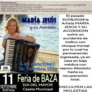 20:30 h. Homenaje a nuestros mayores en la Caseta Municipal, que comenzará con la entrega de premios de los torneos para personas mayores celebrados esa misma mañana. A las 21:00 h. actuación especial “Folklore para nuestros mayores”, a cargo de la Escuela Municipal de Coros y Danzas dirigida por Consuelo Herrera. Para las 22:15 h. estaba previsto el espectáculo “Las canciones de nuestra vida”, cantadas y representadas por María Jesús y su inseparable acordeón, actuación que ha tenido que ser suspendida después de sufrir la cantante un grave accidente de tráfico el pasado 31 de agosto, que le ha obligado a suspender sus actuaciones durante seis semanas, entre otras, su visita a Baza durante la Feria.