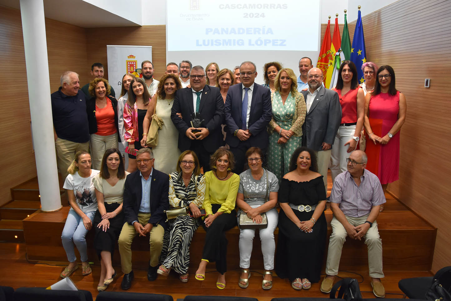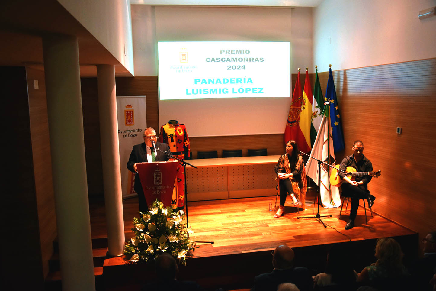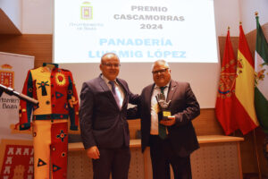 Luis Miguel López, recoge el premio Cascamorras 2024 otorgado a la panadería Luismig López, por sus “Manos de Cascamorras”. En un sencillo acto celebrado en el auditorio del Museo Arqueológico, Luis Miguel López, en nombre de la panadería Luismig López, recogía ayer el premio Cascamorras 2024, de manos del alcalde de Baza, Pedro J. Ramos, como reconocimiento a la labor de promoción y difusión de nuestra Fiesta de Interés Turístico Internacional que realiza este establecimiento bastetano gracias a sus suculentas “Manos de Cascamorras”. Fue un acto al que asistieron también varios miembros de la Corporación Municipal y una amplia representación de la familia del premiado, conocidos todos con el sobrenombre de “Los Vinagres”, así como numerosos amigos y vecinos.