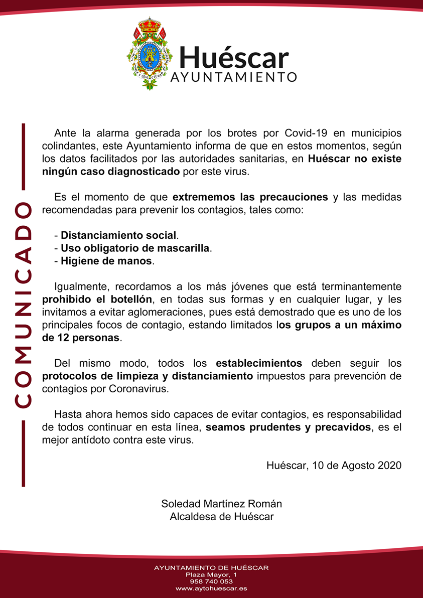 La alcaldesa de Huéscar se dirige a sus vecinos en momentos sin casos diagnosticados en la localidad y pidiendo a los vecinos que extremen sus precauciones. Como ya ha ocurrido con otros alcaldes de la zona, como los de Benamaurel, Orce o La Puebla de don Fadrique, la alcaldesa de Huéscar, la popular Soledad Martínez Román, se ha dirigido a la población oscense mediante un escrito motivado por la alarma generada tras la aparición de brotes en “municipios colindantes”.