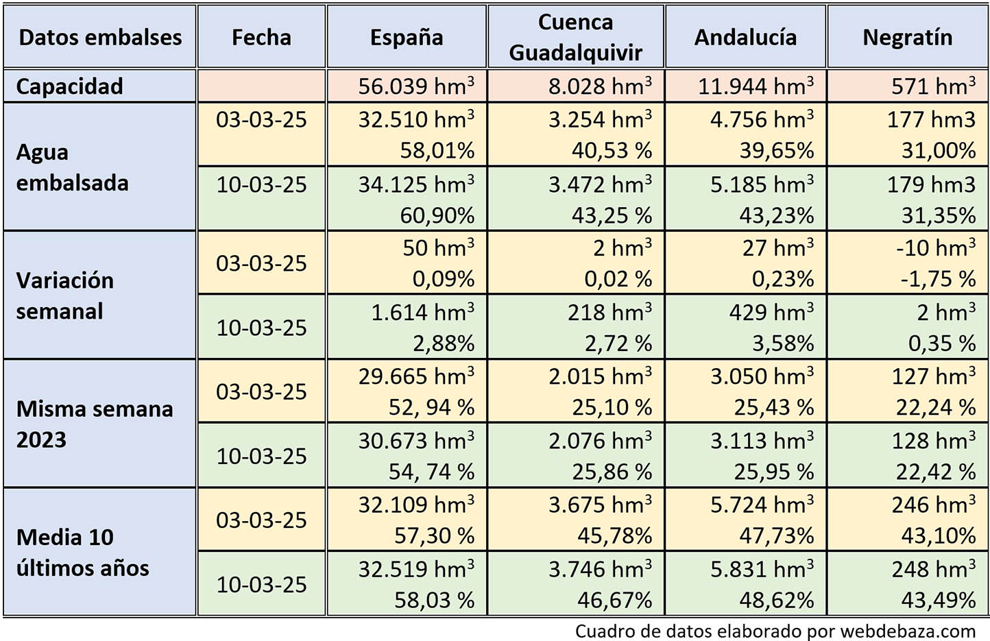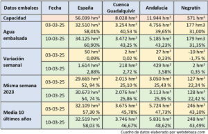Por último, los datos del embalse del Negratín esta semana presenta un aumento que no se corresponde con el agua que ha recibido en realidad, ya que esta misma semana ha desembalsado otros 10 hm3, a pesar de lo cual ha mejorado las cifras de la pasada semana, aumentando respecto a entonces en 2 hm3, almacenando un total de 179 hm3, lo que supone un aumento del 0,35% en este nuevo ciclo semanal que se iniciaba el pasado lunes. A pesar de ello, supera con creces los 128 hm3 que tenía embalsados en la misma semana del pasado año, mientras que esa misma cifra sigue siendo inferior en 69 hm3, si se compara con la media de la misma semana registrada durante los últimos diez años.