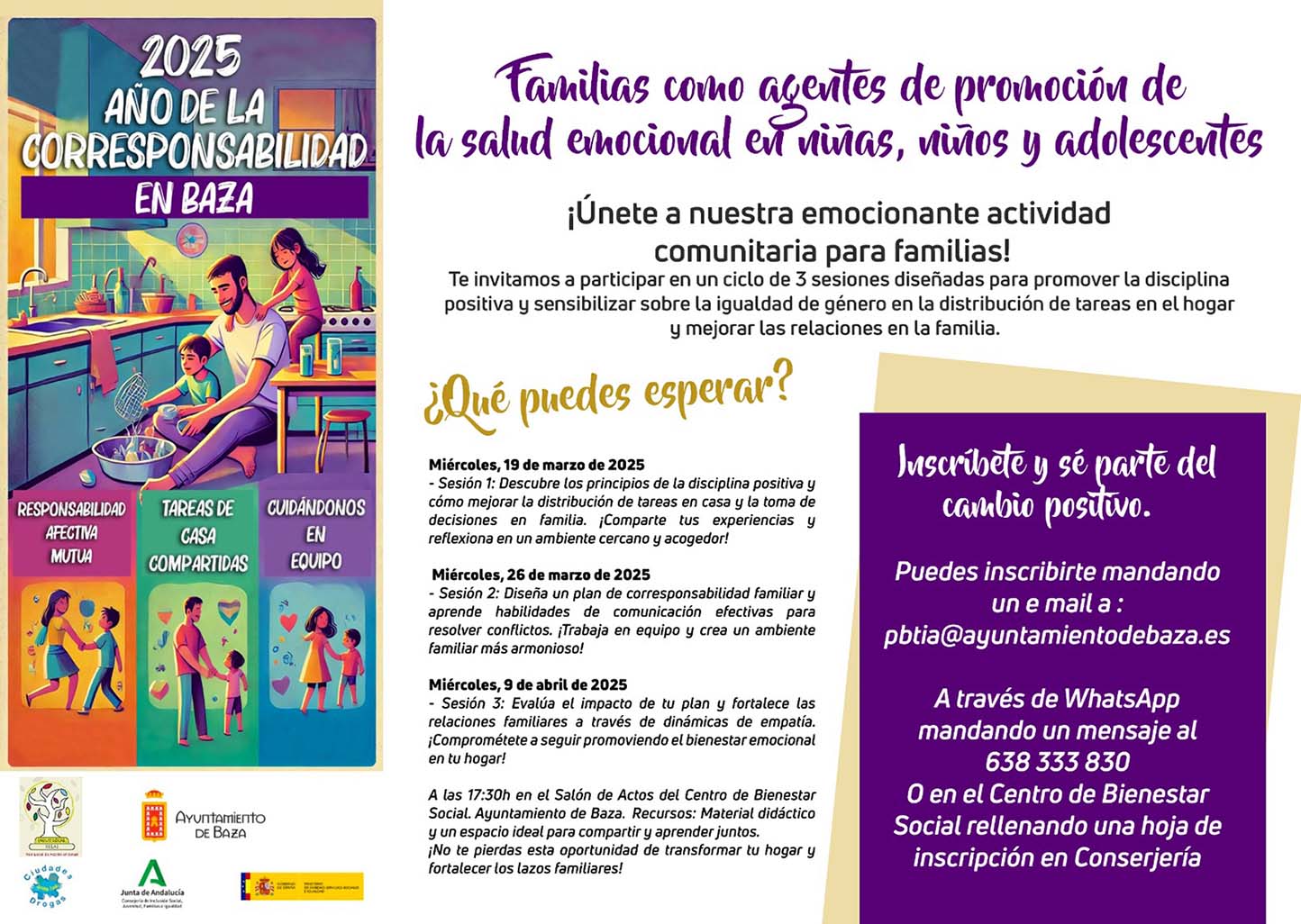 Baza celebra el Año de la Corresponsabilidad Familiar con el objetivo de promover el bienestar infantil y adolescente. Este 2025, Baza se convierte en el epicentro del Año de la Corresponsabilidad Familiar, una iniciativa impulsada por el Área de Bienestar Social del Ayuntamiento de Baza para promover el bienestar infantil y adolescente a través del reparto equilibrado de decisiones y tareas en el hogar.