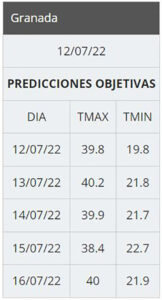 En el caso de Baza los peores días llegarán a partir de hoy, a la par que se activan sendas alertas con avisos de nivel amarillo para hoy y mañana y unas previsiones por las que las temperaturas podrían llegar hasta los 40,2ºC en el día de hoy y a los 39,9ºC de mañana jueves. Temperaturas altas que no bajarán y previsiones que no bajarán en los próximos días, con cifras previstas de hasta 38,4ºC y 40ºC para el viernes 15 y sábado 16, respectivamente.