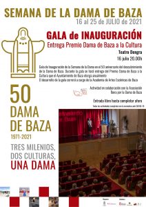 La Semana de la Dama de Baza inaugura oficialmente este viernes 16 de julio el 50 Aniversario del Descubrimiento de la Dama. El Ayuntamiento de Baza y la Diputación de Granada han organizado una completa Semana de la Dama de Baza que arranca este viernes 16 de julio con la gala inaugural y acto entrega del Premio Dama de Baza a la Cultura. La programación de la Semana, que abarca del 16 al 25 de julio, incluye música, teatro, poesía, arqueogastronomía, ocio y mucho más, siempre con la cultura íbera como eje central. Y sirve como inicio a todo un año de actividades diseñadas para conmemorar de forma especial el 50 Aniversario del Descubrimiento de la Dama de Baza.
