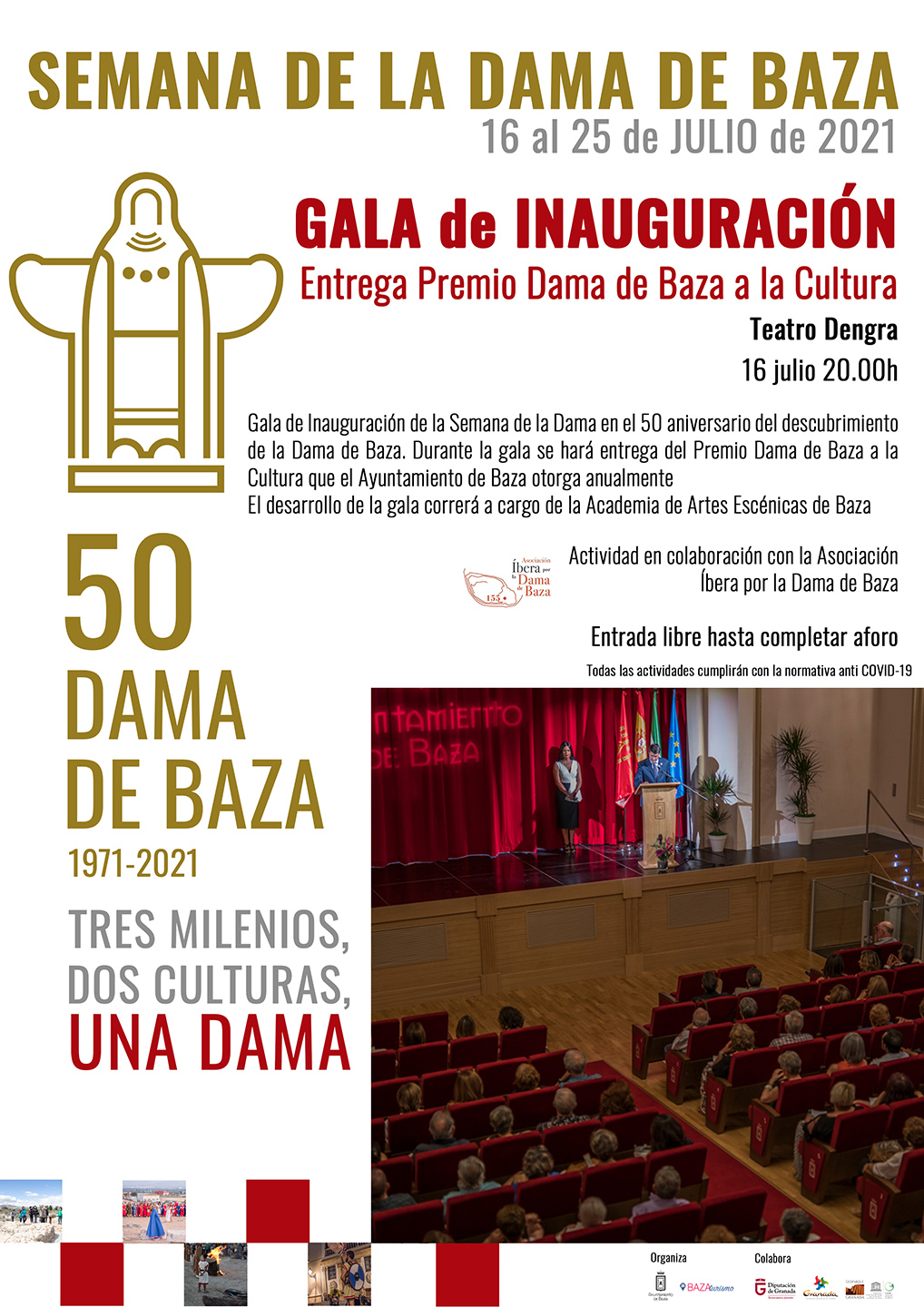 Gala inaugural del 50 Aniversario del descubrimiento de la Dama de Baza y acto de entrega del Premio Dama de Baza a la Cultura. El Teatro Dengra de Baza acoge este viernes 16 de julio la Gala Inaugural del 50 Aniversario del Descubrimiento de la Dama de Baza y acto de entrega del Premio Dama de Baza a la Cultura, con el que este año se distingue al arqueólogo Alejandro Caballero.