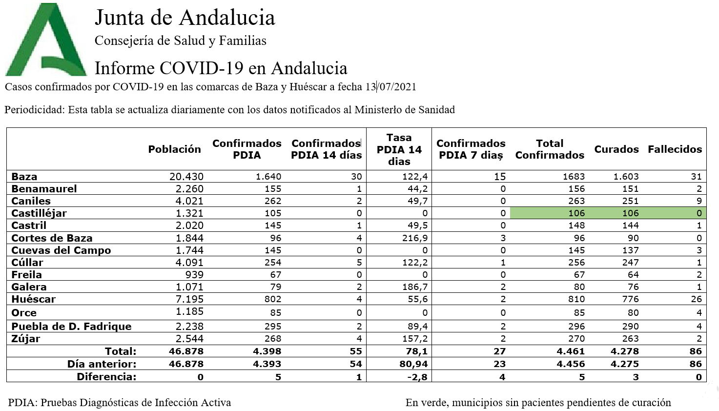 En cuanto a las cifras facilitadas por la Consejería de Salud de la Junta de Andalucía, referidas a las comarcas de Baza y Huéscar, se ha producido una leve mejora en algunos municipios, con un resultado global de 5 nuevos casos confirmados y un leve descenso de 2,8 puntos en la tasa de incidencia por 100.000 habitantes a 14 días, mientras que la cifra de curados ha sumado 3 casos más y suman ya 4.278, frente al total de casos confirmados que es de 4.461, tal y como puede verse en la tabla que adjuntamos a esta noticia.