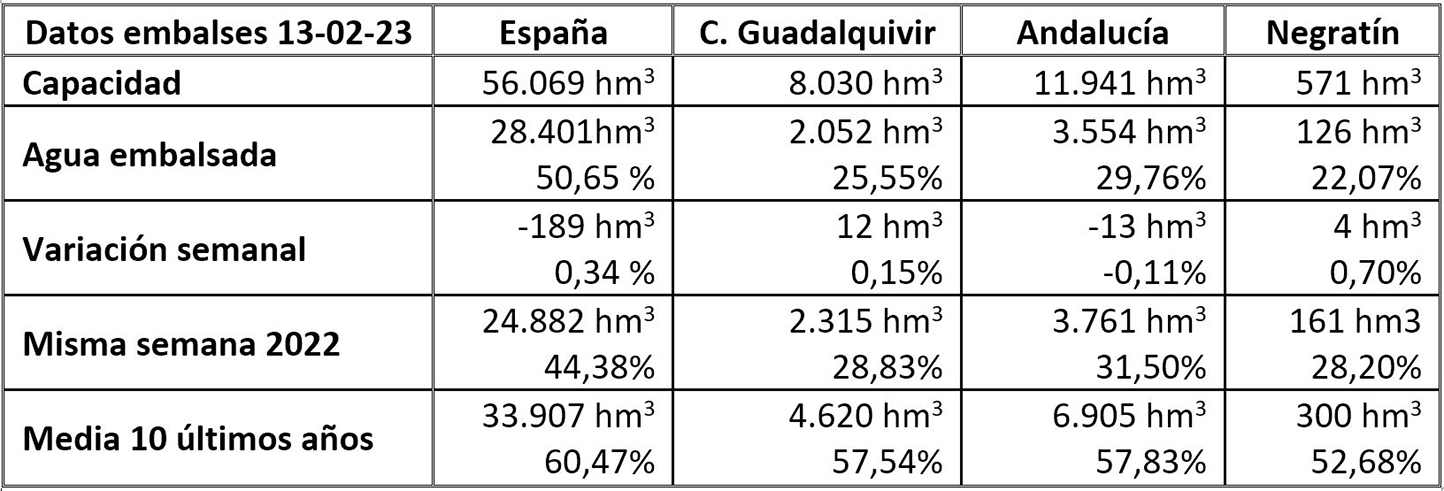 Pequeño descenso del agua embalsada a nivel nacional y en Andalucía, mientras la Cuenca del Guadalquivir y el Negratín registran un pequeño aumento. Los nuevos datos de los embalses se daban a conocer ayer, con mediciones referidas al pasado lunes 13 de febrero, con unas cifras que marcan diferencias con la tónica habitual, ya que tanto en Andalucía como a nivel nacional ha disminuido el embalsamiento, mientras que la Cuenca del Guadalquivir y el embalse del Negratín han mejorado sus cantidades, si bien en ambos casos hablamos de situaciones prolongadas de sequía, por lo que la poca agua que reciben supone siempre un aumento. De hecho, el Negratín ha crecido en 4 hm3, cifra que viene a ser la tercera parte del aumento de toda la cuenca hidrográfica, a pesar de que las precipitaciones siguen siendo bastante escasas.