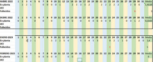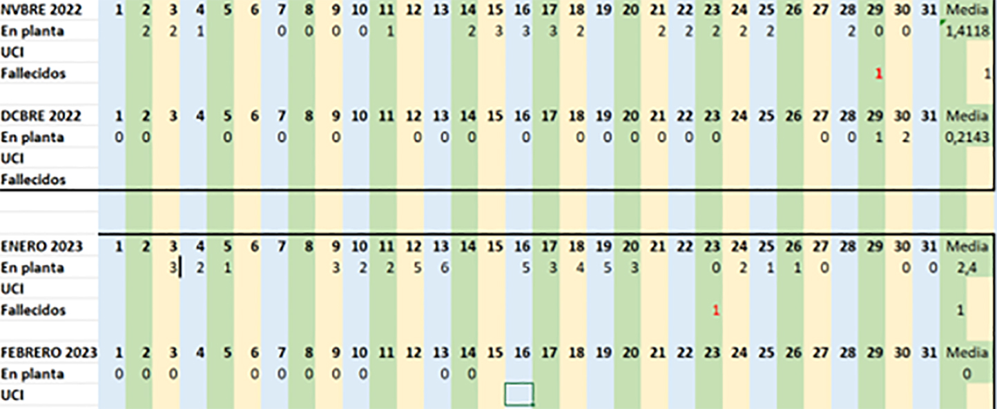 A partir de ahí, los ingresos habidos, solo superaron en cinco ocasiones la cantidad de tres pacientes e incluso hasta hubo ya alguna jornada en la que se vaciaron todas las camas ocupadas por este motivo. Bien es cierto también que, durante los últimos episodios de noviembre de 2022 y enero de 2023 se produjeron dos nuevos fallecimientos, por este motivo.