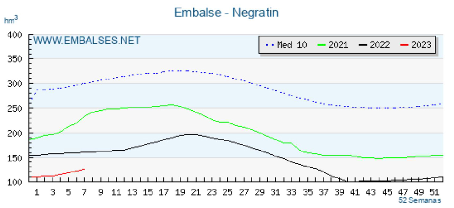 Así, la reserva hídrica de toda España es de 28.401 hectómetros cúbicos, que supone disminuir al 50,65% de su capacidad, mientras que el Negratín ha vuelto a crecer esos 4 hectómetros, gracias al agua que siguen aportando las pocas nieves y escasa lluvia en la zona, lo que ha servido para superar ya el 22% de su capacidad y almacenar 126 hm3., tras un nuevo aumento.