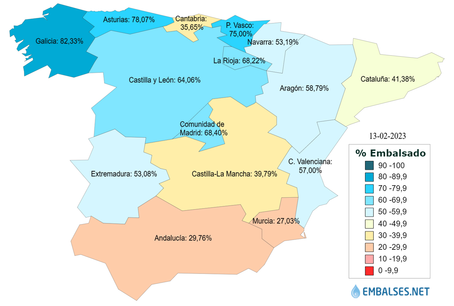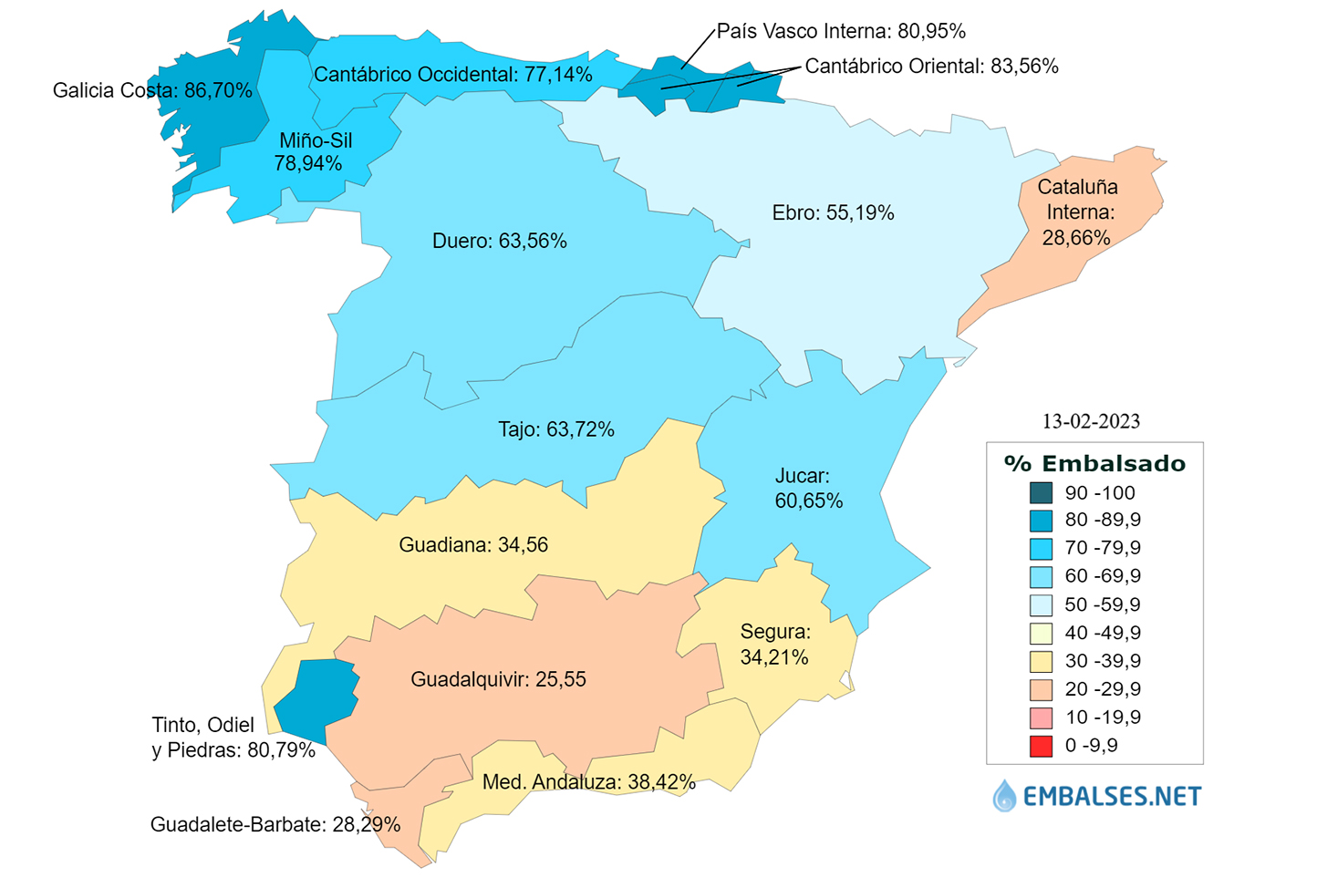 En cuanto a la reserva por ámbitos, la situación de mayor a menor cantidad de agua almacenada en las diferentes cuencas, es la siguiente: Galicia Costa se encuentra al 86,7%, Cantábrico Oriental al 83,6%, Cuencas internas del País Vasco al 81%, Tinto, Odiel y Piedras al 80,8%, Miño-Sil al 78,9%, Cantábrico Occidental al 77,1%, Tajo al 63,7%, Duero al 63,6%, Júcar al 60,6%, Ebro al 55,2%, Cuenca Mediterránea Andaluza al 38,4%, Guadiana al 34,6%, Segura al 34,2%, Cuencas internas de Cataluña al 28,7%, Guadalete-Barbate al 28,3% y Guadalquivir al 25,6%
