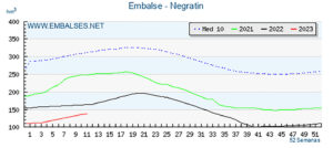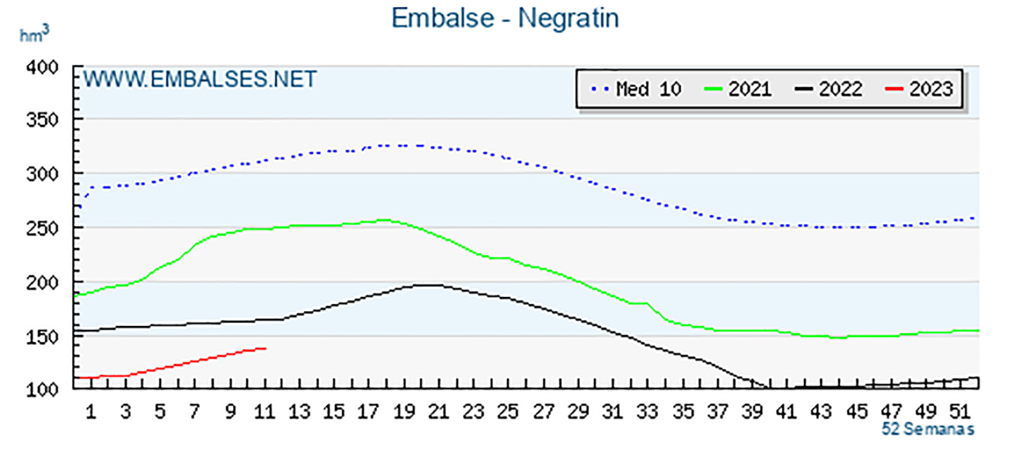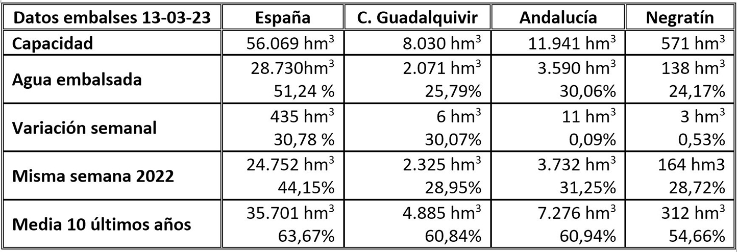 Así, la reserva hídrica de toda España es de 28.730 hectómetros cúbicos, que supone una mejora hasta alcanzar ya el 51,24% de su capacidad, mientras que el Negratín ha vuelto a crecer esos 3 hectómetros semanales que vienen siendo costumbre y que dejan ver la escasez de precipitaciones caídas en la zona, a pesar de lo cual ha vuelto a crecer hasta alcanzar el 24,17% de su capacidad total, lo que supone un almacenamiento de 138 hm3, que siguen siendo bastante insuficientes para afrontar los regadíos que se esperan poder abastecer con el agua de este embalse.