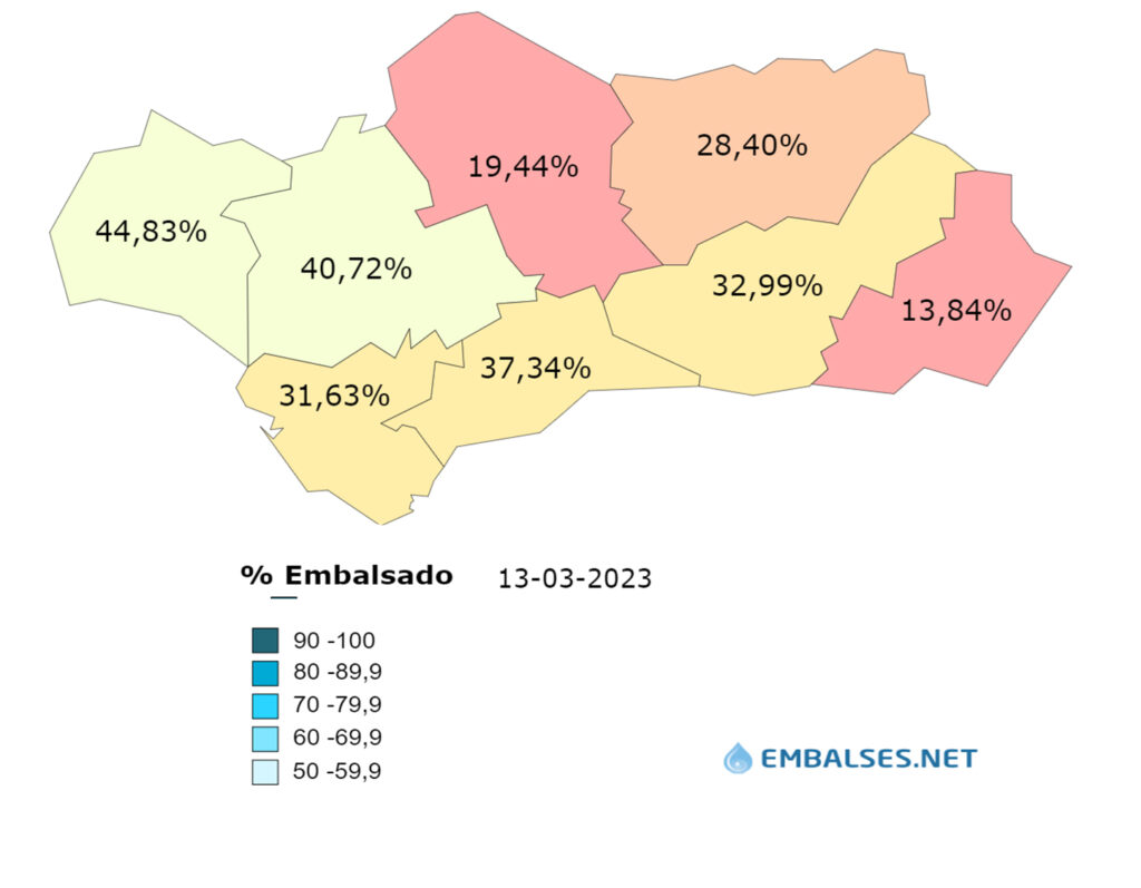 Una situación que sigue caracterizada por la falta de precipitaciones, sobre todo en la vertiente mediterránea y en las cuencas andaluzas y murciana, precisamente las únicas cuyos embalses están más cerca del 25% que del 60% que es el porcentaje que superan las restantes cuencas españolas, con la única excepción de la Cuenca del Ebro que está cercana ya al 59% de su capacidad total.
