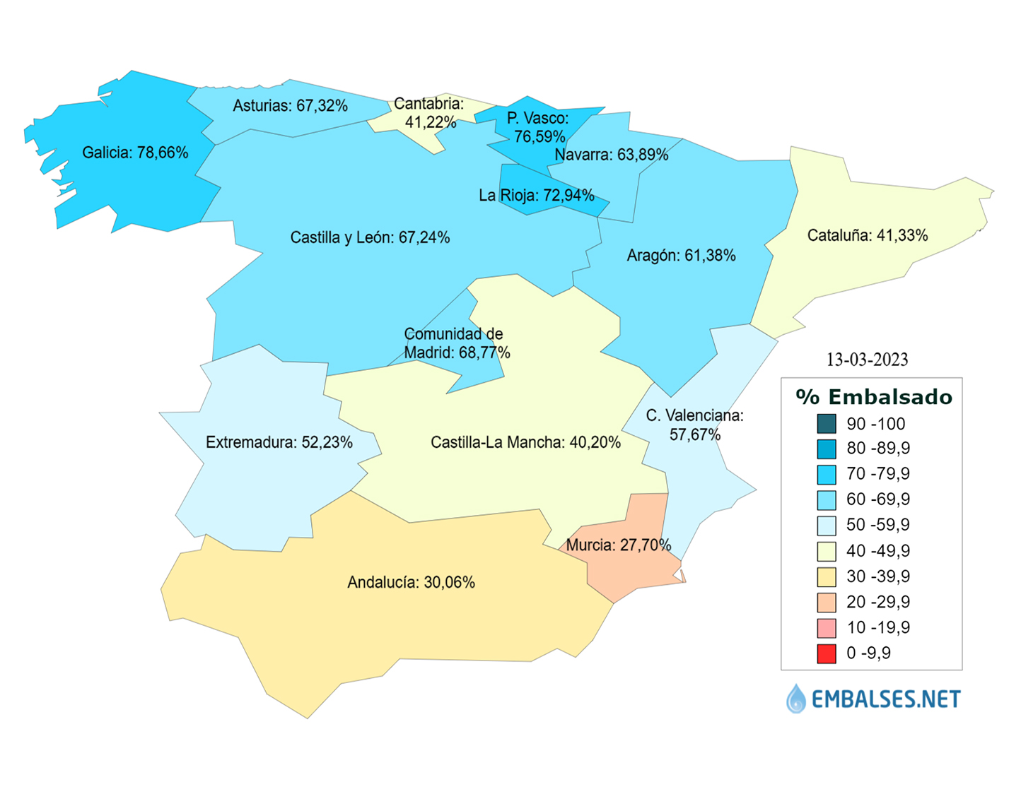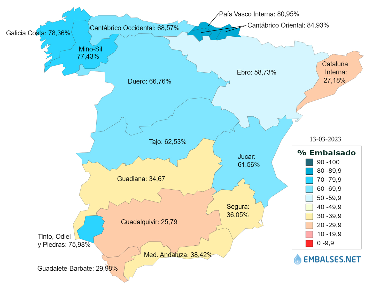 En cuanto a la reserva por ámbitos, la situación ordenada de mayor a menor cantidad de agua almacenada en las diferentes cuencas, es la siguiente: Cantábrico Oriental se encuentra al 84,9%, Cuencas internas del País Vasco al 81%, Galicia Costa al 78,4%, Miño-Sil al 77,4%, Tinto, Odiel y Piedras al 76%, Cantábrico Occidental al 68,6%, Duero al 66,8%, Tajo al 62,5%, Júcar al 61,6%, Ebro al 58,7%, Cuenca Mediterránea Andaluza al 38,4%, Segura al 36,1%, Guadiana al 34,7%, Guadalete-Barbate al 30%, Cuencas internas de Cataluña al 27,2% y la cuenca del Guadalquivir que está al 25,8%.
