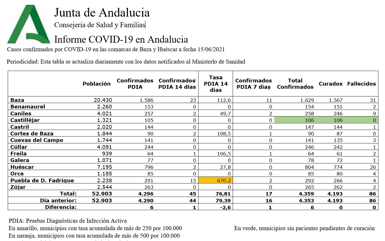 En cuanto a los datos de la Consejería de Salud de la Junta de Andalucía referidos a las comarcas de Baza y Huéscar, la principal novedad en los últimas cifras dadas a conocer ha sido la pequeña variación producida en algunos municipios, por nuevos casos de Covid, que ha hecho que aumenten sus tasas de incidencia, aunque con una importancia relativa. Además se han sumado 6 nuevos casos confirmados, en total, mientras el balance final no contabilizaba ningún curado, conforme se puede apreciar en el balance que acompaña a esta noticia.