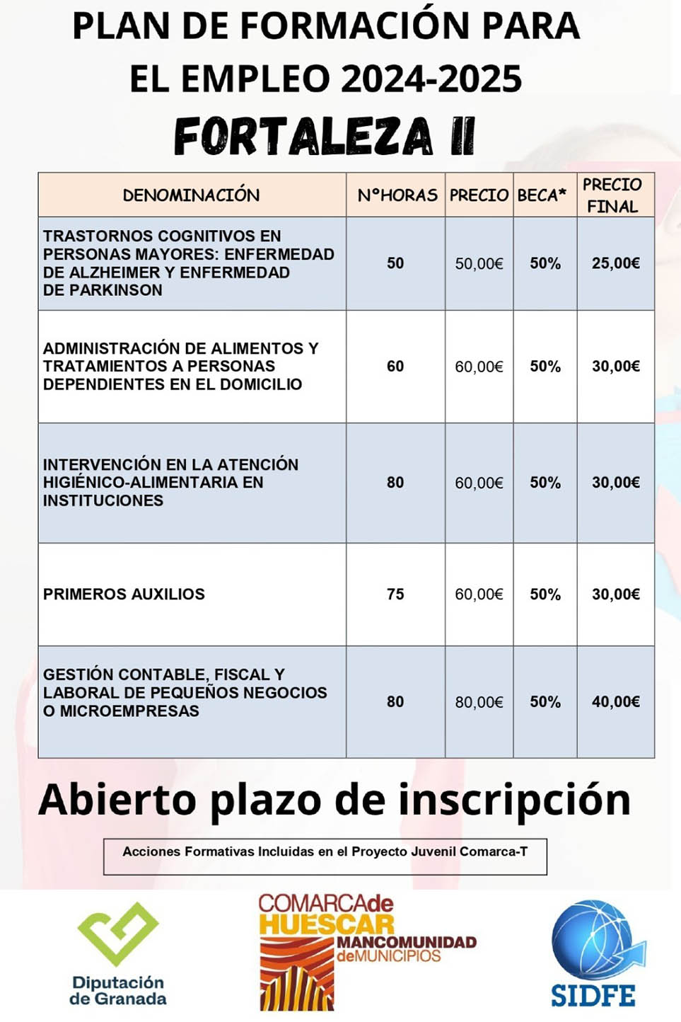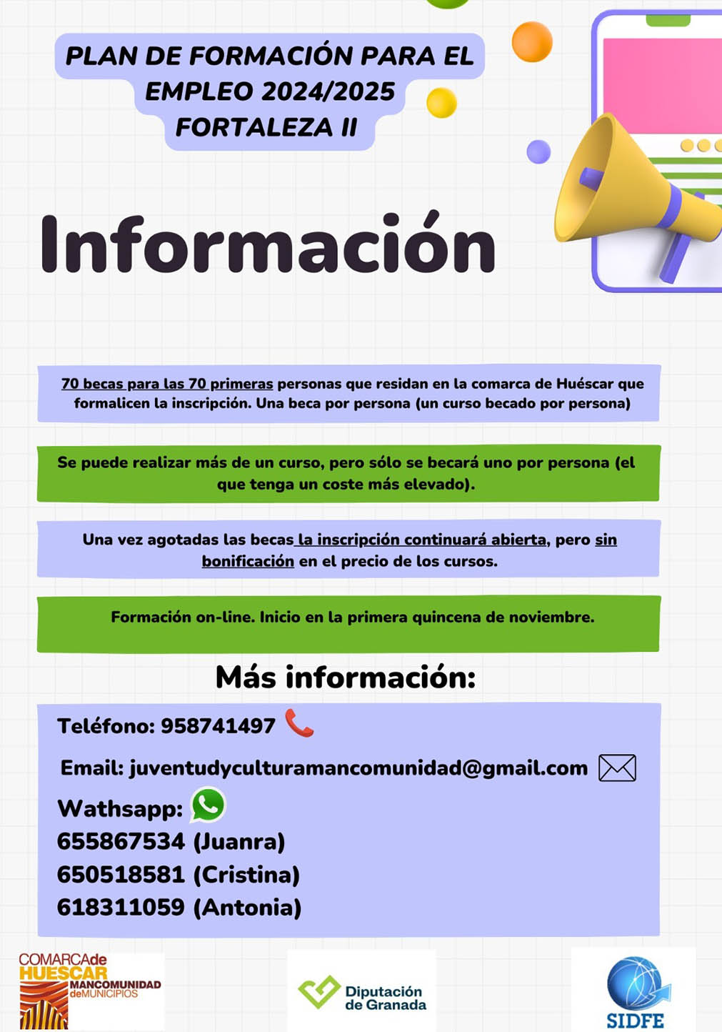 La Mancomunidad de Municipios Comarca de Huéscar, con la colaboración del Área de Juventud de la Diputación de Granada, lanzan su Segundo Plan de Formación “Fortaleza. Se trata de un plan integrado por varios cursos que darán comienzo en la primera quincena de noviembre, y se llevarán a cabo en la modalidad de Teleformación.