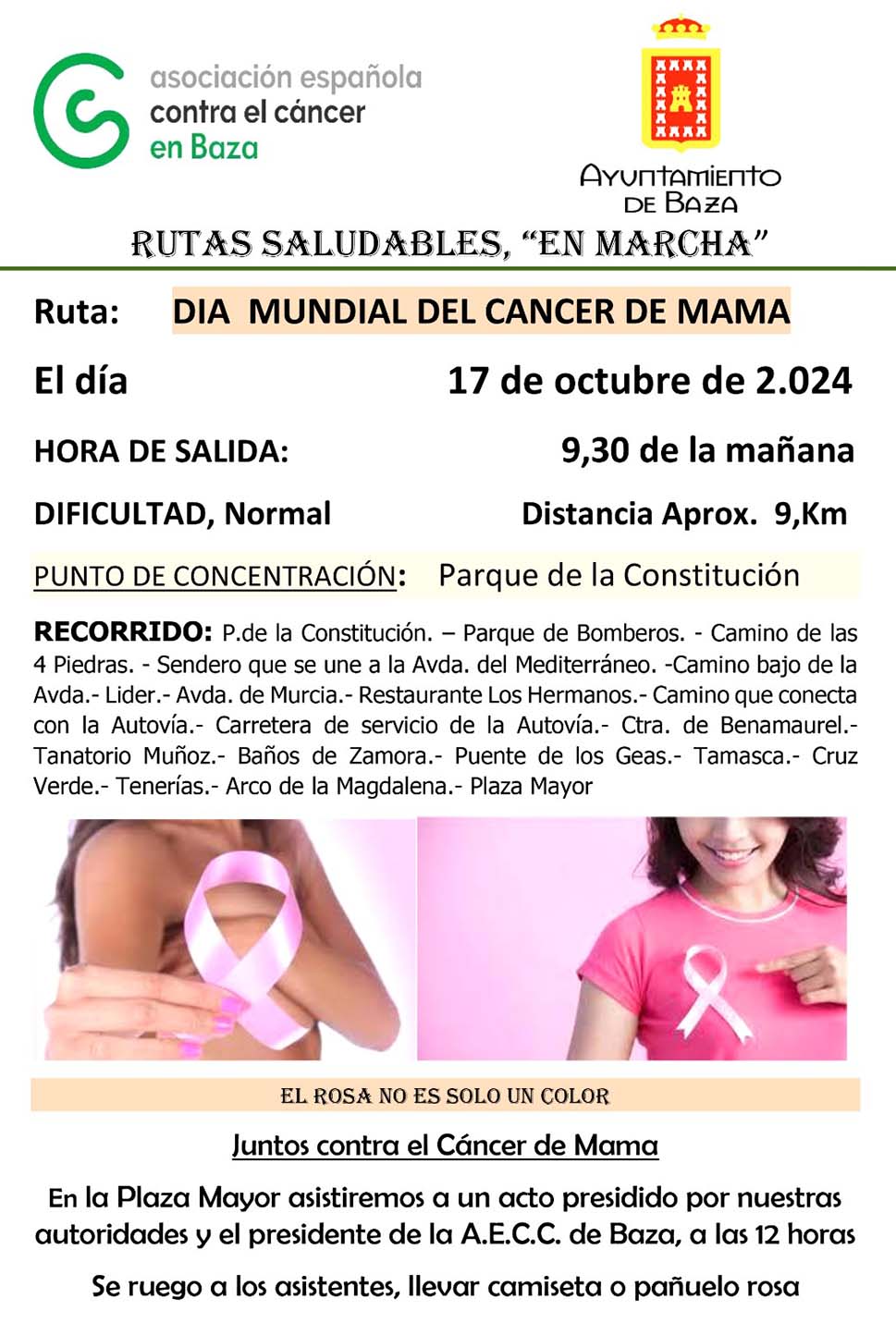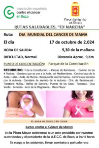 La AECC celebra mañana una Ruta saludable que finalizará con la asistencia a los actos que se celebrarán en la Pl. Mayor con motivo del Día Mundial del Cáncer de Mama. La conmemoración dl Día Mundial del Cáncer de Mama incluye entre sus actos la celebración de una Ruta Saludable que se llevará a cabo mañana, jueves 17 de octubre, partiendo desde el Parque de la Constitución, donde se realizará la concentración previa, a las 9:30 horas.