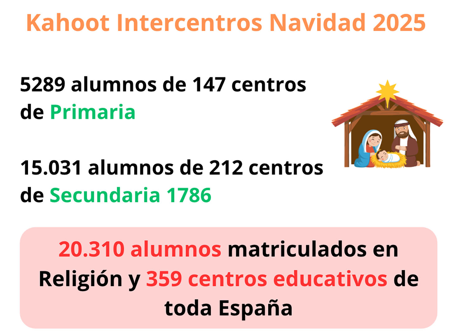 Más de 20.000 estudiantes participan en el mayor Kahoot intercentros de Religión celebrado en España. El VI Kahoot Intercentros Nacional Navideño 2025 ha reunido durante los días 9, 10, 11, 12 y 15 de diciembre a un total de 20.310 alumnos matriculados en la asignatura de Religión de 359 centros educativos de toda España, convirtiéndose en una de las experiencias colectivas más amplias y participativas desarrolladas hasta la fecha en esta materia. El alumnado se conectó de manera simultánea desde sus aulas, compartiendo una actividad común con centros de distintos puntos del país.