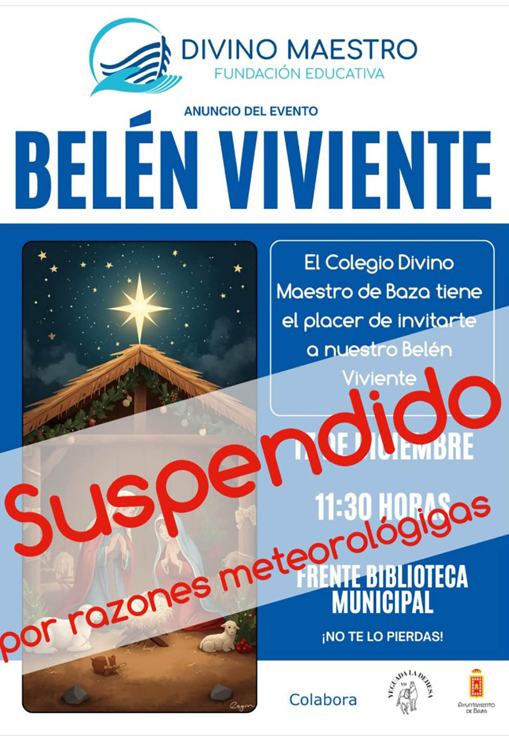 La climatología adversa que se está registrando estos días en Baza ha obligado a suspender el Belén Viviente previsto para hoy. El Belén Viviente organizado por el Colegio “Divino Maestro”, que iba a celebrarse este miércoles 17 de diciembre a las 11:30 horas, en la explanada junto a la Biblioteca Municipal, no podrá finalmente llevarse a cabo debido a lo adverso de las condiciones meteorológicas que se viven en Baza estos días.