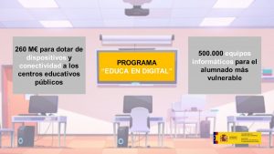 Este programa prevé destinar hasta 260 millones de euros, de los que 70 millones serán de las Comunidades Autónomas, para dotar de dispositivos y conectividad a centros de titularidad pública que pondrán a disposición de los alumnos más vulnerables, mediante préstamo, dispositivos que faciliten la educación digital en el centro y desde el hogar con una actuación de emergencia puede alcanzar los 500.000 equipos.