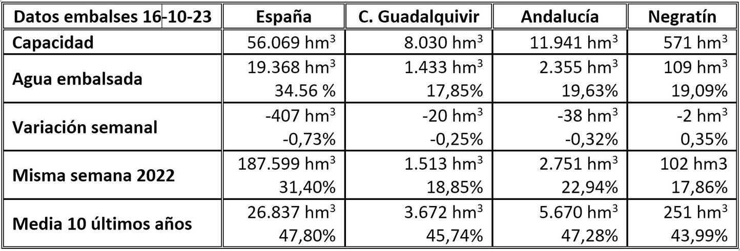 En la fecha citada, la reserva hídrica española estaba en 19.368 hm3, es decir, se encuentran al 34,56% por ciento de su capacidad total, lo que supone un descenso acumulado en los últimos siete días de 407 hm3 que equivalen a un 0,73% de su capacidad; los de la Cuenca del Guadalquivir almacenaban el pasado lunes 1.433 hm3 equivalentes a un 17,85%, tras una pérdida de 20 hm3; los de la Comunidad de Andalucía también bajaban a 2.355 hm3 que suponen un 19,63% y una pérdida de 42 hm3 que les lleva a bajar del 20% mientras que a nivel más cercano, el embalse del Negratín contiene 109 hm3 que le llevan a poner en peligro su actual porcentaje del 19%, al quedarse este lunes en un 19,09%,si bien en el día de ayer seguía en un cambio de tendencia positivo al estar recibiendo algo más de agua de sus aportes, tras las escasas lluvias de, fin de semana, que en el caso de Baza fueron de tres litros por metro cuadrado, el pasado sábado.