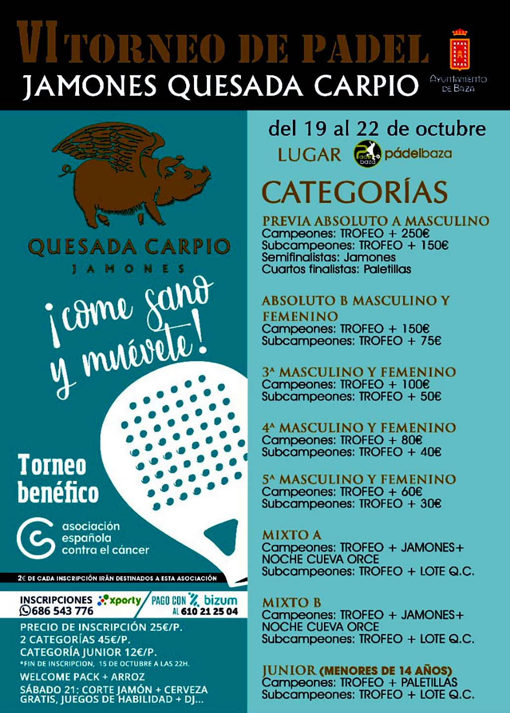 Desde el jueves 19 de octubre y hasta el domingo se celebrará la sexta edición del Torneo de pádel “Jamones Quesada Carpio”, que se desarrollará en las instalaciones de Pádel Baza. Se trata de un torneo benéfico, cuyas inscripciones pueden realizarse en la plataforma xporty, con un costo de dos euros para cada inscripción, importe que se entregarán a la Junta Local de la Asociación Española Contra el Cáncer de la ciudad. Habrá animación para todos, tanto participantes como público asistente, en una cita que contempla varias categorías: Previa Absoluta A Masculina, Absoluta B (Masculina y Femenina), 3ª, 4ª y 5ª (Masculina y Femenina), Mixta A y B, Junior y para menores de 14 años. Las inscripciones.