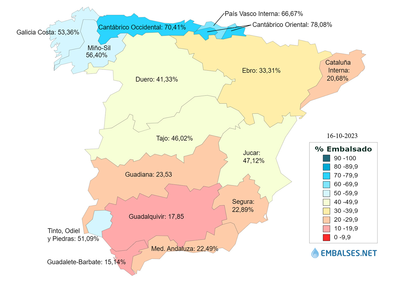 En el otro extremo, y por debajo del 30% están la cuenca del Guadiana al 23,5%, Segura al 22,9%, Cuenca Mediterránea Andaluza al 22,5%, Cuencas internas de Cataluña al 20,7%, Guadalquivir al 17,9% y Guadalete-Barbate al 15,1%