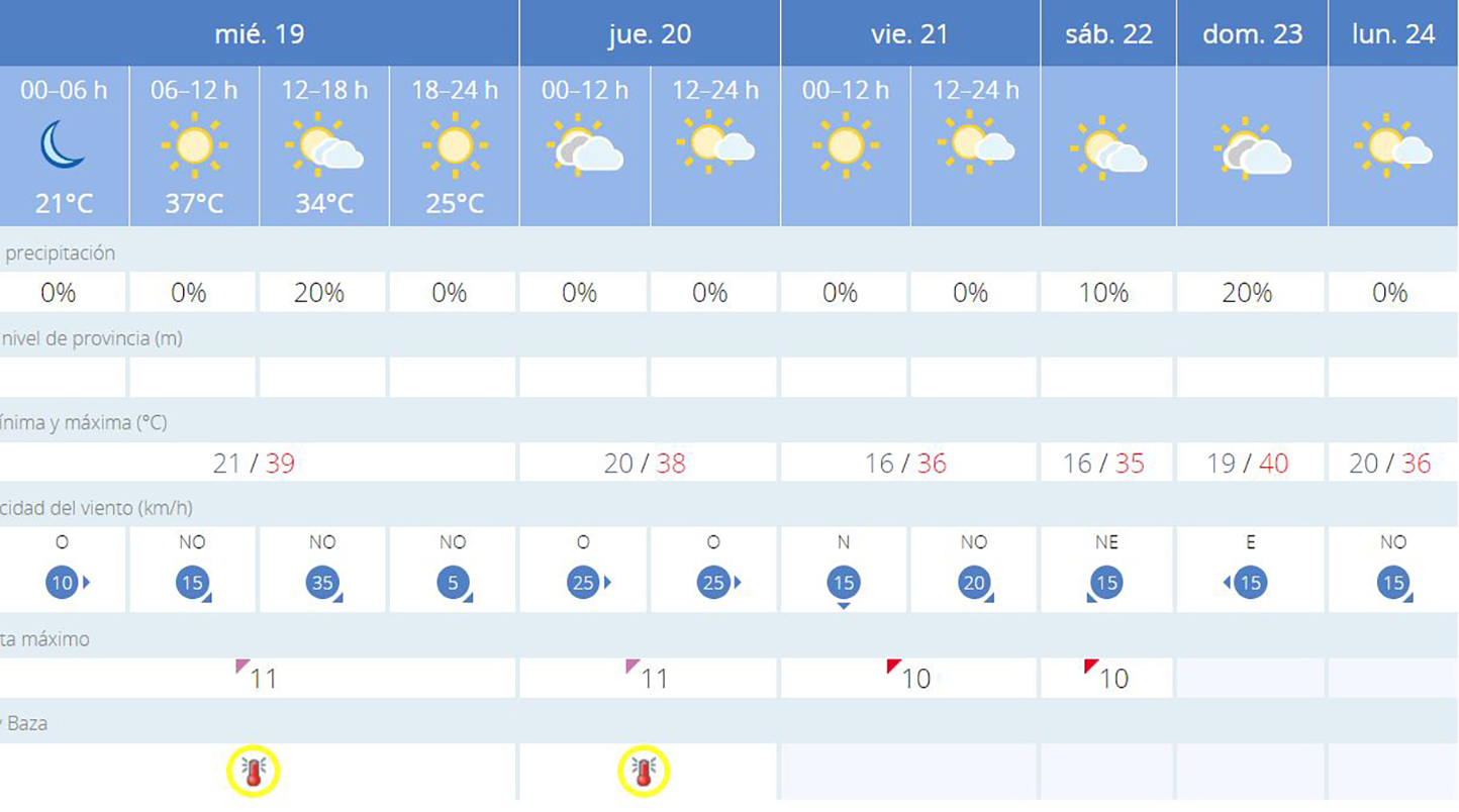 Un verano que empieza hoy a cambiar a la baja, con una previsión de 21/39ºC como mínima y máxima para hoy; temperaturas que descenderán ambas en un grado para el jueves 20, dos jornadas estas en las que hay activado un aviso de nivel amarillo por la Agencia Estatal de Meteorología, en Baza y las comarcas del norte granadino que, por cierto, estarán casi rodeadas de comarcas con avisos naranja.