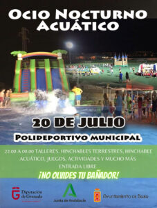 El Ocio Nocturno se traslada a la piscina del Polideportivo y ya se anuncia que el barrio de Santiago prepara su Semana Cultural. El mes de julio afronta ya su segunda quincena que, al igual que la primera, viene cargada de actividades para todas las edades, en Baza. La campaña “Verano Joven” nos ofrece, como novedad de esta semana, el traslado del Ocio Nocturno a la Piscina Municipal del Polideportivo, donde se han preparado los hinchables terrestres y acuáticos y muchos juegos para todos los participantes, iniciándose las actividades a partir de las diez de la noche y siendo prenda recomendable el bañador.