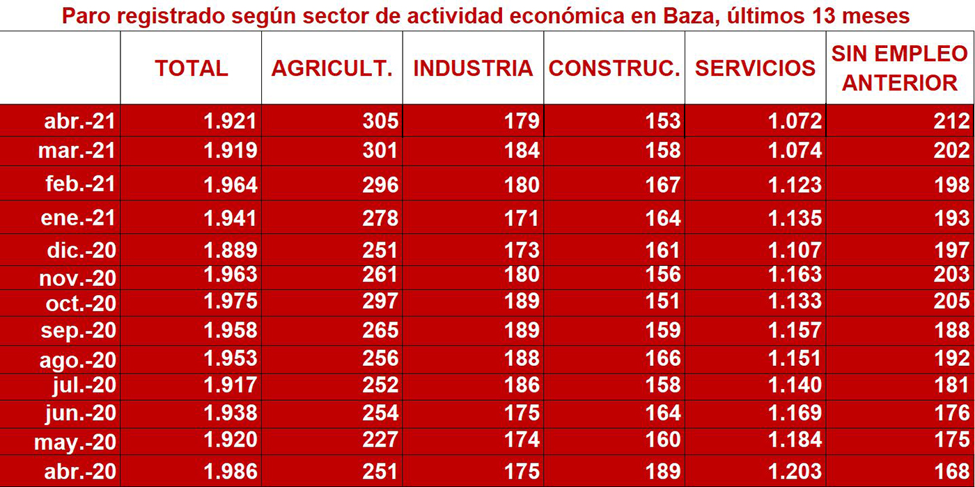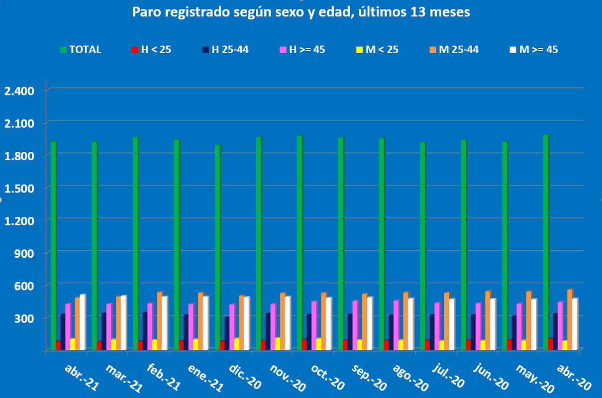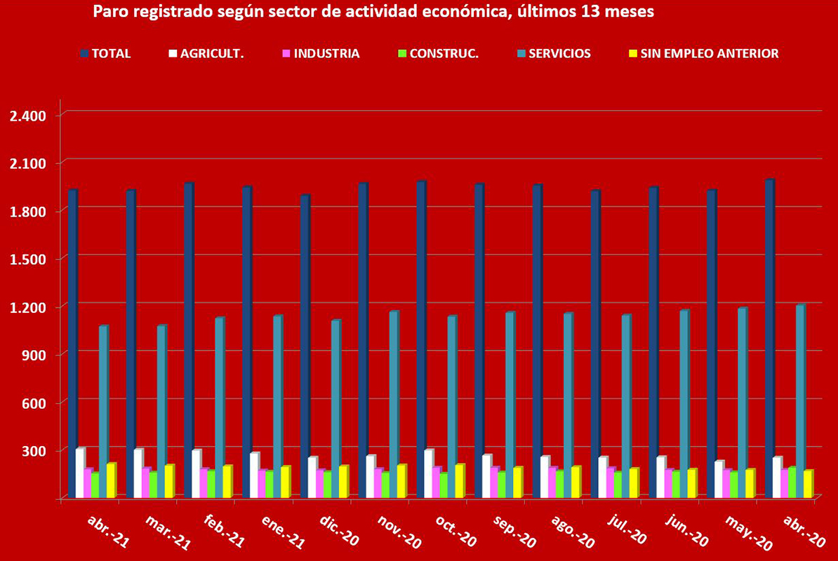 Una situación que se repite también en el mes de abril y de la que el indicativo más explicativo es que la cifra de 1.919 parados del mes de marzo, ha pasado a ser 1.921, es decir, 2 personas más. Si además nos fijamos en el mes de mayo del pasado año, recordaremos que la cifra de parados de entonces era de 1.920, algo que refuerza aún más que esta situación está siendo afectada de manera notable por los cambios normativos que se aplican en materia laboral y en lo que tienen especial incidencia los ERTE que obligan a no acudir a los despidos.