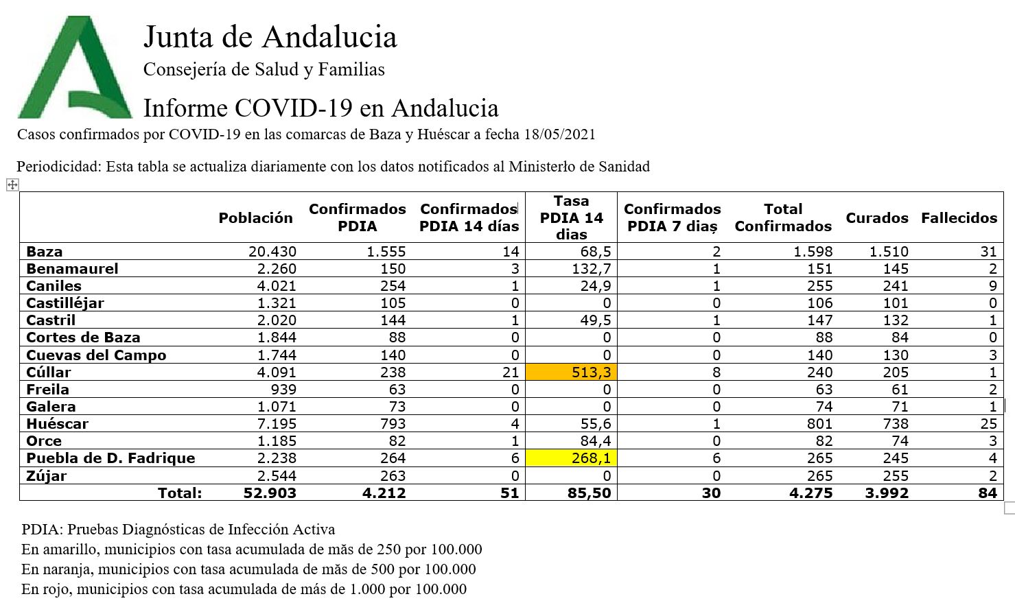 Por último, dejar constancia en la tabla adjunta de los últimos datos facilitados por la Consejería de Salud de la Junta de Andalucía y referidos a las 14 poblaciones que conforman las comarcas de Baza y Huéscar