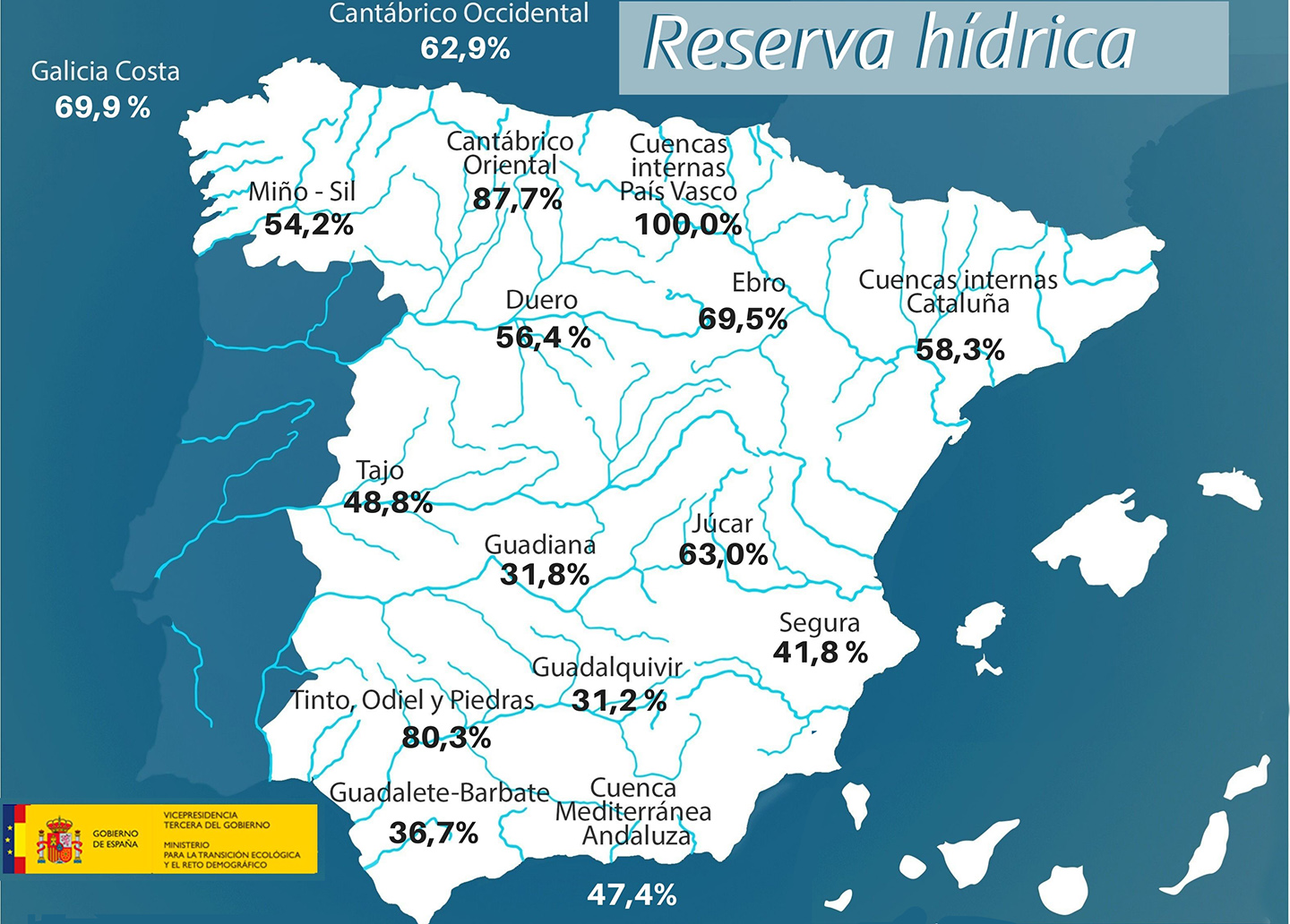 La reserva por ámbitos sigue siendo bastante más elevada en los territorios conocidos como dela España húmeda, dándose casos como las cuencas internas del País Vasco, que están al 100,0%, o el Cantábrico Oriental, que se encuentra al 87,7%. En el lado contrario encontramos la zona del Guadiana al 31,8%, la Cuenca Mediterránea Andaluza al 47,4% o la Cuenca del Guadalquivir, que está al 31,2%, tras una semana en la que las precipitaciones han sido abundantes en la vertiente Mediterránea y han afectado considerablemente a la vertiente Atlántica.