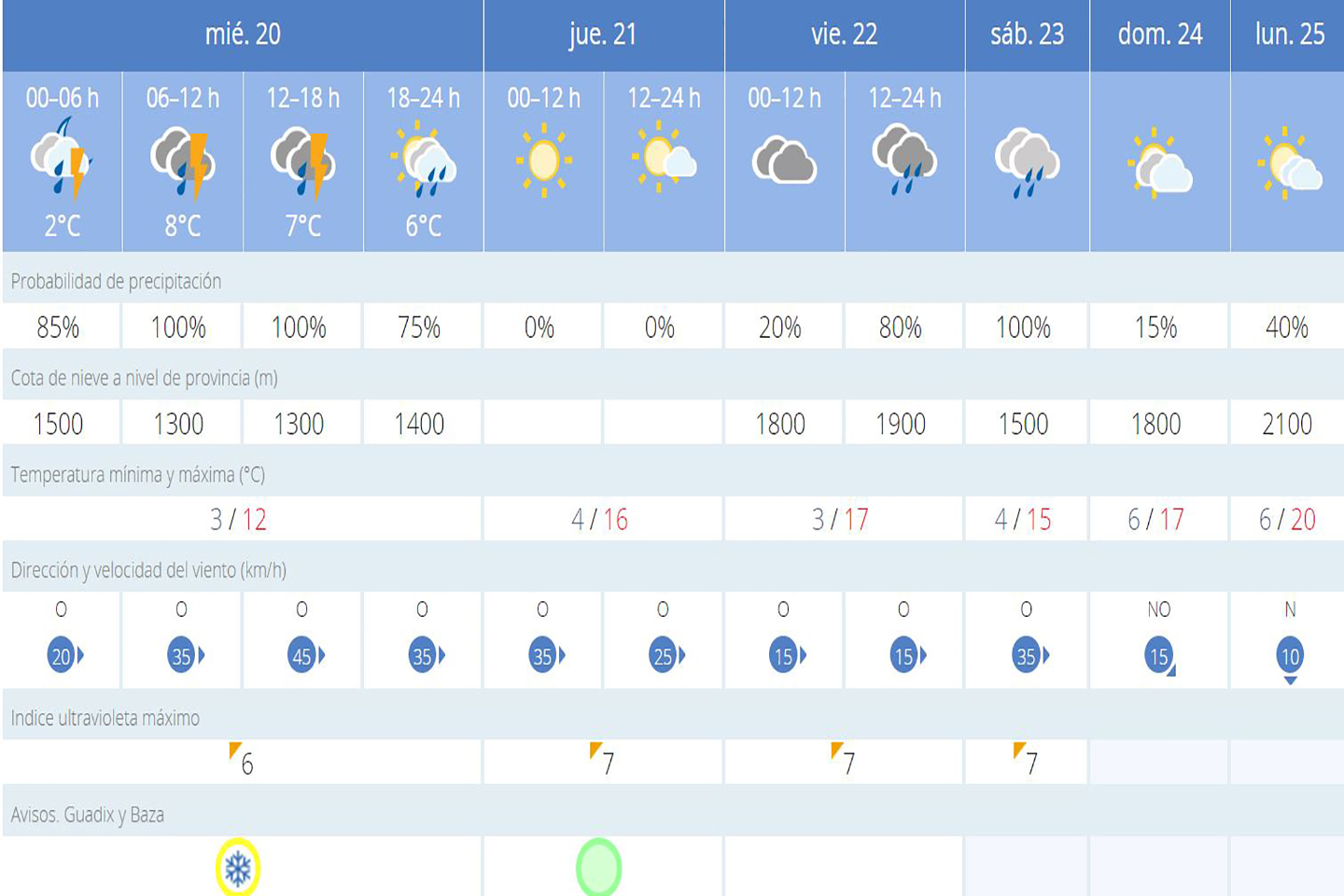 Además, la jornada se presenta con una alerta amarilla por nevadas, que estará vigente toda la jornada, y que prevé nevadas de 3 cm acumulados en 24 h., en las comarcas del norte granadino y en las colindantes de la provincia de Almería, así como en las del norte de Jaén que son limítrofes con la nuestra. Nieve que se espera, fundamentalmente, por encima de los 1000 o 1200 metros, y con la cota que irá subiendo a medida que avance la tarde, por lo que las acumulaciones más importantes serán en la primera mitad del día. Mientras tanto, la jornada se inicia con un 85% de probabilidades de precipitaciones que, a partir de las seis de la madrugada pasarán a ser del 100% y se mantendrán así hasta mediada la tarde, cuando pasarán a ser de un 75%. Además, las rachas de viento no solo no desaparecerán en todo el día, sino que alcanzarán los 45 km/h.