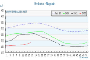 En un ámbito más cercano, el embalse del Negratín se encontraba ayer al 31,92% de su capacidad de agua embalsada, lo que equivale a 181hm3, lo que supone una variación con respecto a la semana anterior, de 4hm3 más, que equivalen a un aumento del 0.71% y todo ello teniendo en cuenta la capacidad de embalsamiento que tiene este pantano, que es de 567hm3.