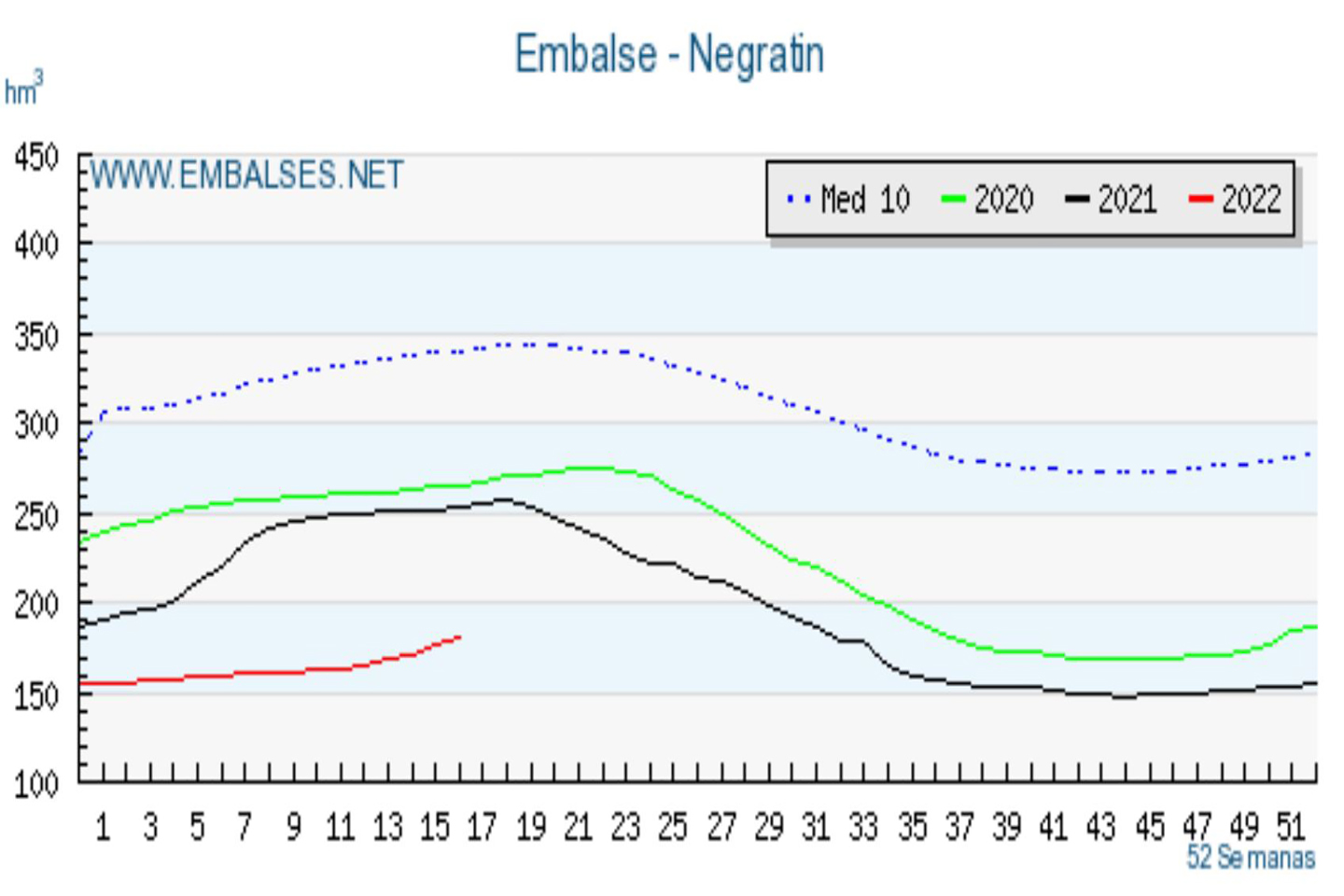 Para tener una idea más clara de lo que está suponiendo la situación de sequía por la que atraviesa esta zona, digamos que en la misma semana del pasado año, había embalsados 253hm3 equivalentes a un 44.62% del total y que la media de los últimos años, en la misma semana, es de 340hm3 con los que el porcentaje de almacenamiento era del 59.96% de su capacidad total.