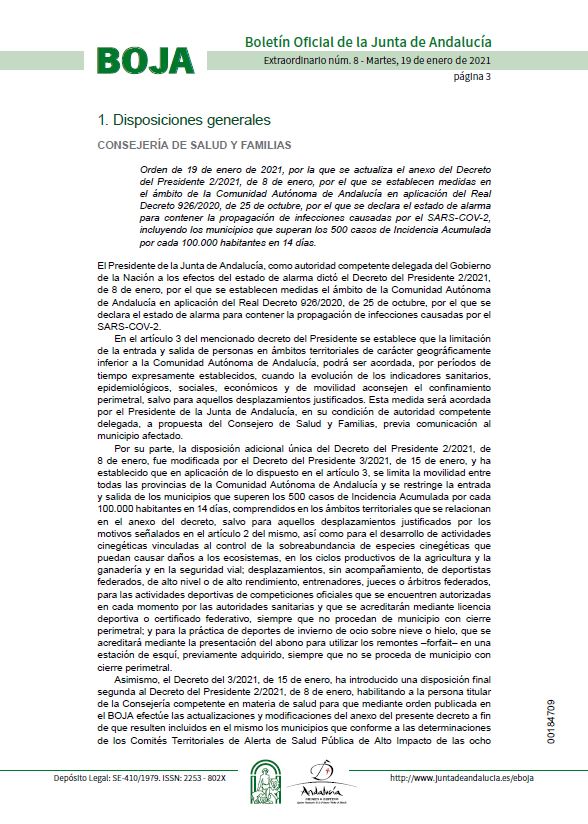El BOJA extraordinario publicado ayer decretaba el confinamiento de Granada capital y otros 25 municipios, a propuesta del Comité Territorial de Alerta de Salud Pública de Alto Impacto. Una publicación que contenía la resolución de 18 de enero de 2021, de la Delegación Territorial de Salud y Familias en Granada, sobre la adopción de los niveles de alerta sanitaria y la aplicación de las medidas adoptadas para tratar de contener la COVID-19 en la provincia, destacando el confinamiento de Granada ciudad, a partir de las 00:00 horas de hoy miércoles.