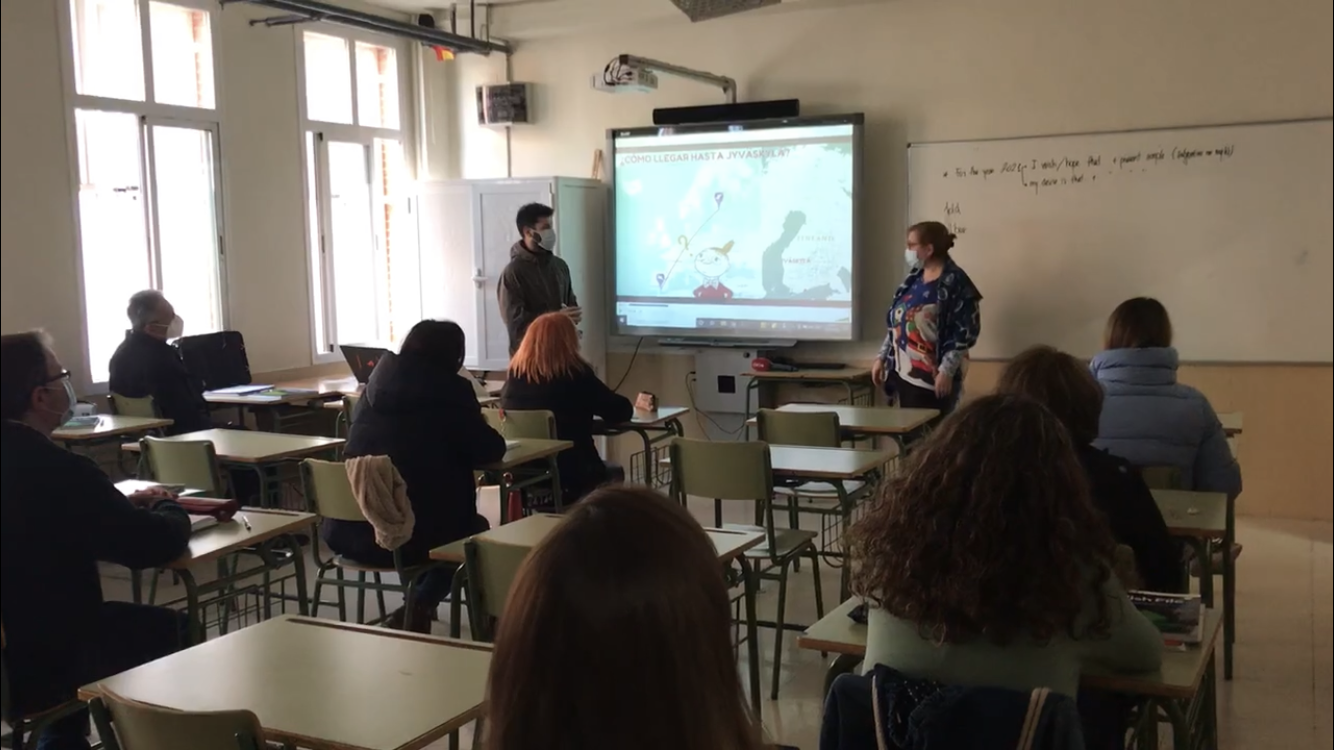 Una vez comenzado el curso y retomada una cierta normalidad, el profesorado decidió llevar a cabo esta exposición en el hall del centro, actividad que se completó con el visionado de un vídeo en el que el profesorado implicado explicó su experiencia del sistema de enseñanza de idiomas a adultos en 2 centros finlandeses de la ciudad de Jyväskylä.