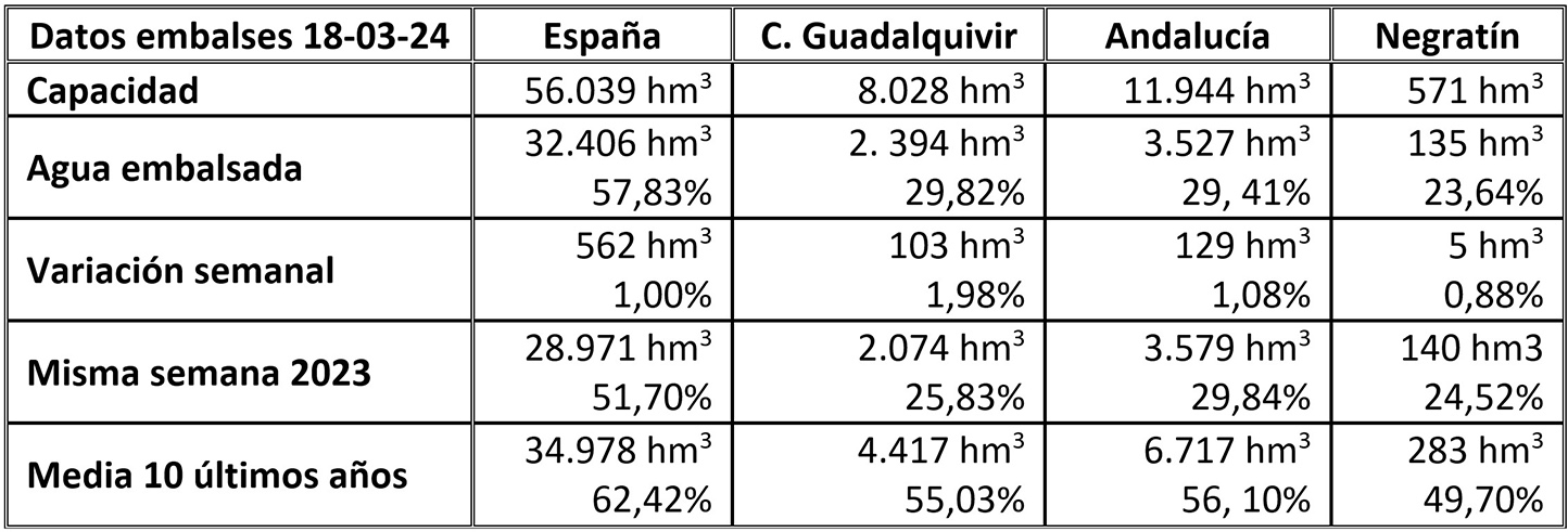 Notable incremento de agua embalsada en los embalses españoles que esta vez sí se ha reflejado en la Cuenca del Guadalquivir, Andalucía y el embalse del Negratín. La reserva hídrica española está al 57,8% de su capacidad total, con unos embalses que almacenan actualmente 32.406 hectómetros cúbicos (hm³) de agua, aumentando en la última semana en 562 hectómetros cúbicos (el 1,0% de la capacidad total actual de los embalses).