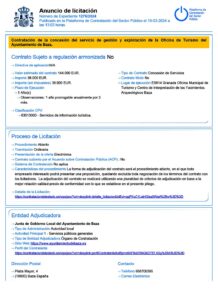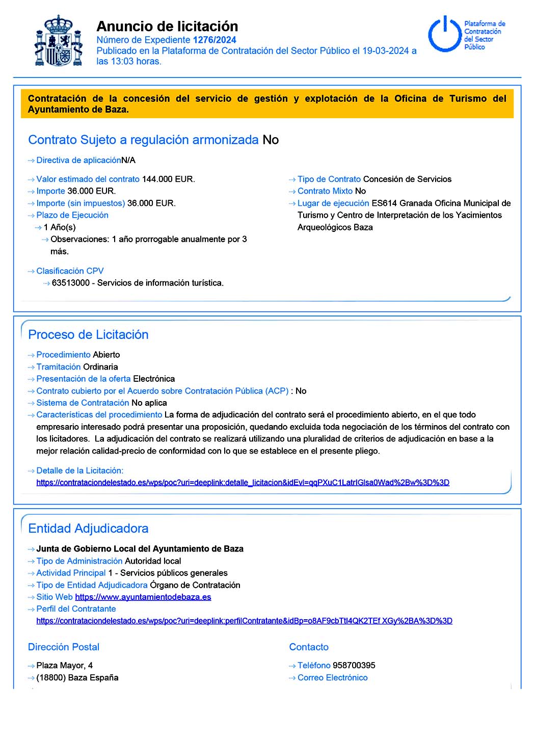 La Oficina de Turismo del Ayuntamiento de Baza se encuentra en periodo de licitación para la concesión del servicio de gestión y explotación. La Plataforma de Contratación del Sector Público tiene ya publicado el anuncio de licitación que rige la contratación de la concesión del servicio de gestión y explotación de la Oficina de Turismo del Ayuntamiento de Baza. El presupuesto base de esta licitación es de 36.000 euros, exento de IVA, en concepto de subvención al déficit del servicio, y el periodo de duración del contrato será de un año, prorrogable anualmente durante tres años más.
