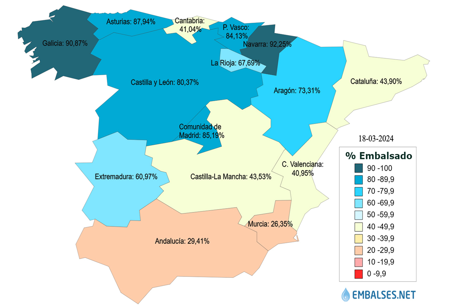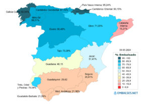 Las cuencas que se encuentran con un almacenamiento superior al 60% son: Cuencas internas del País Vasco al 95,2%, Cantábrico Oriental se encuentra al 93,2%, Galicia Costa al 92,5%, Miño-Sil al 88,5%, Cantábrico Occidental al 87,8%, Duero al 80,5%, Tinto, Odiel y Piedras al 79%, Tajo al 73,3% y Ebro al 71,1%