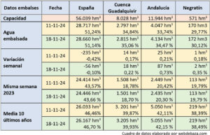 La reserva hídrica española se encuentra al 51,1% de su capacidad, tras disminuir en 56 hm3, mientras el embalse del Negratín llega a los 172 hm3, 2 más que hace una semana. La reserva hídrica española está al 51,1% de su capacidad total de almacenamiento, con sus embalses que almacenan actualmente 28.660 hectómetros cúbicos (hm³) de agua, según los últimos datos del pasado lunes 18 de noviembre.