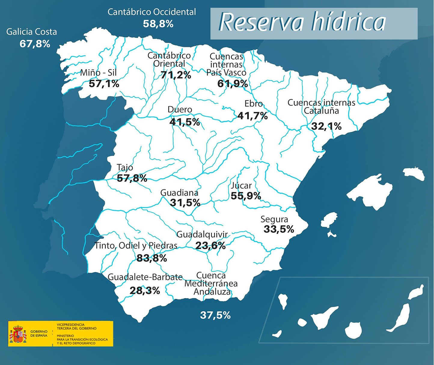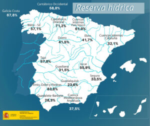 En cuanto a la reserva por ámbitos de las diferentes cuencas españolas, destacan las que están por encima del 60% de su capacidad: Tinto, Odiel y Piedras al 83,8%, Cantábrico Oriental al 71,2%, Galicia Costa al 67,8% y Cuencas internas del País Vasco al 61,9%. Hay otro grupo intermedio de cuencas que están entre el 30 y el 60%, que son las del Cantábrico Occidental al 58,8%, Tajo al 57,8%, Miño-Sil al 57,1%, Júcar al 55,9%, Ebro al 41,7%, Duero al 41,5%, Cuenca Mediterránea Andaluza al 37,5%, Segura al 33,5%, Cuencas internas de Cataluña al 32,1% y Guadiana al 31,5%. Por último, el grupo de las cuencas que no llegan al 30% de su capacidad de almacenamiento total está integrado por las del Guadalete-Barbate al 28,3% y el Guadalquivir al 23,6%