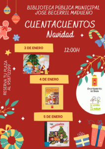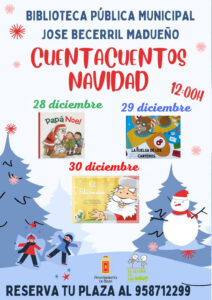 Pero, aunque este sea el último de la programación habitual, se ha diseñado una programación especial Navidad los días 28, 29 y 30 de diciembre a las 12h con los cuentos “Papá Noel”, “La huelga de los carteros” y “El felicímetro”. También habrá una programación especial de año nuevo y Reyes los días 3, 4 y 5 de enero, igualmente a las 12h. En todos los casos, hay que reservar la plaza previamente en el 958 712 299.