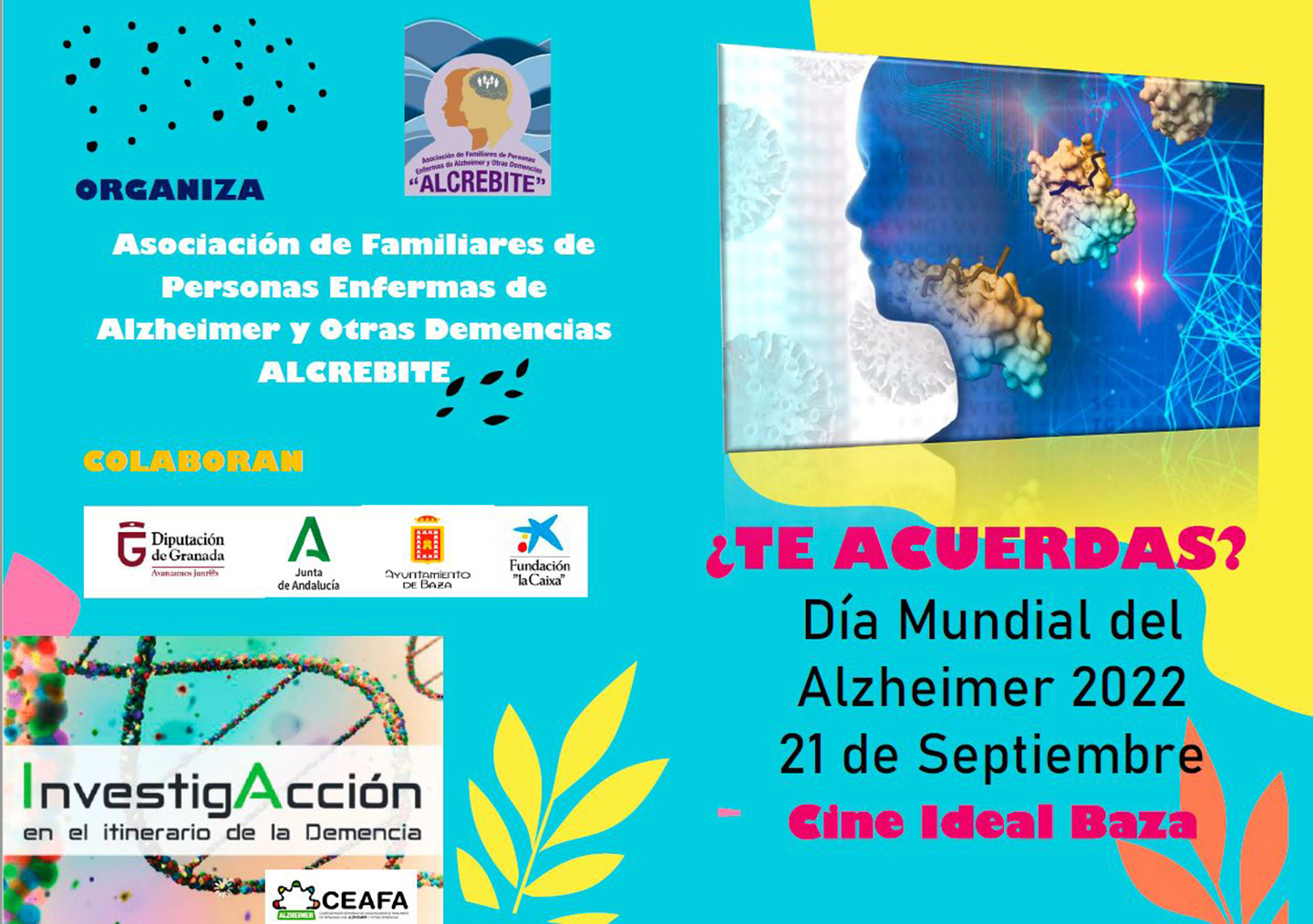 El Ayuntamiento de Baza colabora en el encuentro organizado este 21 de septiembre por AFA ‘Alcrebite’ con motivo del Día Mundial del Alzheimer. “¿Te acuerdas? Día Mundial del Alzheimer 2022”. Con ese título se celebrará este miércoles, 21 de septiembre, en Cine Ideal Baza, a partir de las cinco y media de la tarde, un encuentro en el que colabora el Ayuntamiento de Baza y que está organizado por la Asociación de Familiares de Personas Enfermas de Alzheimer y Otras Demencias ‘Alcrebite’ con motivo del Día Mundial del Alzheimer que se conmemora cada 21 de septiembre.